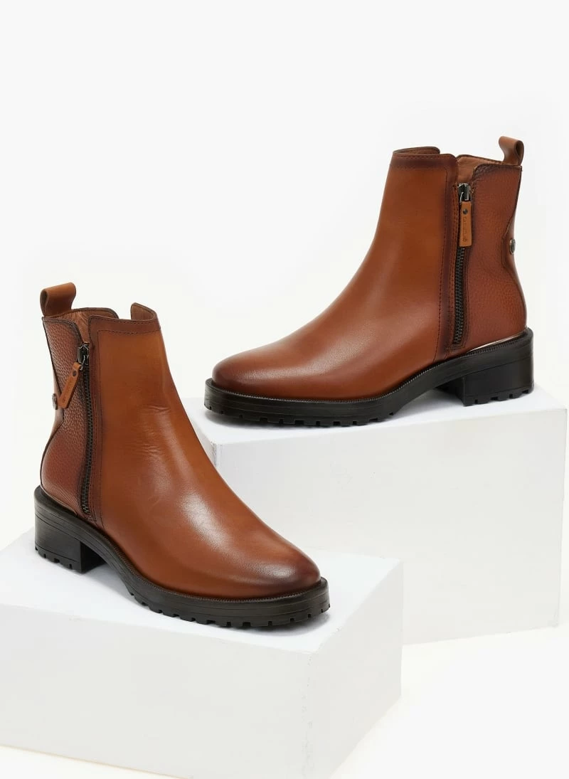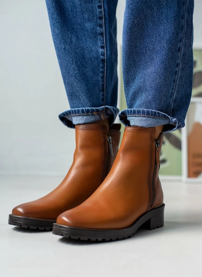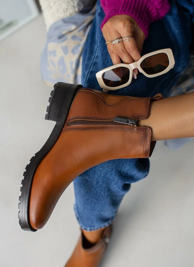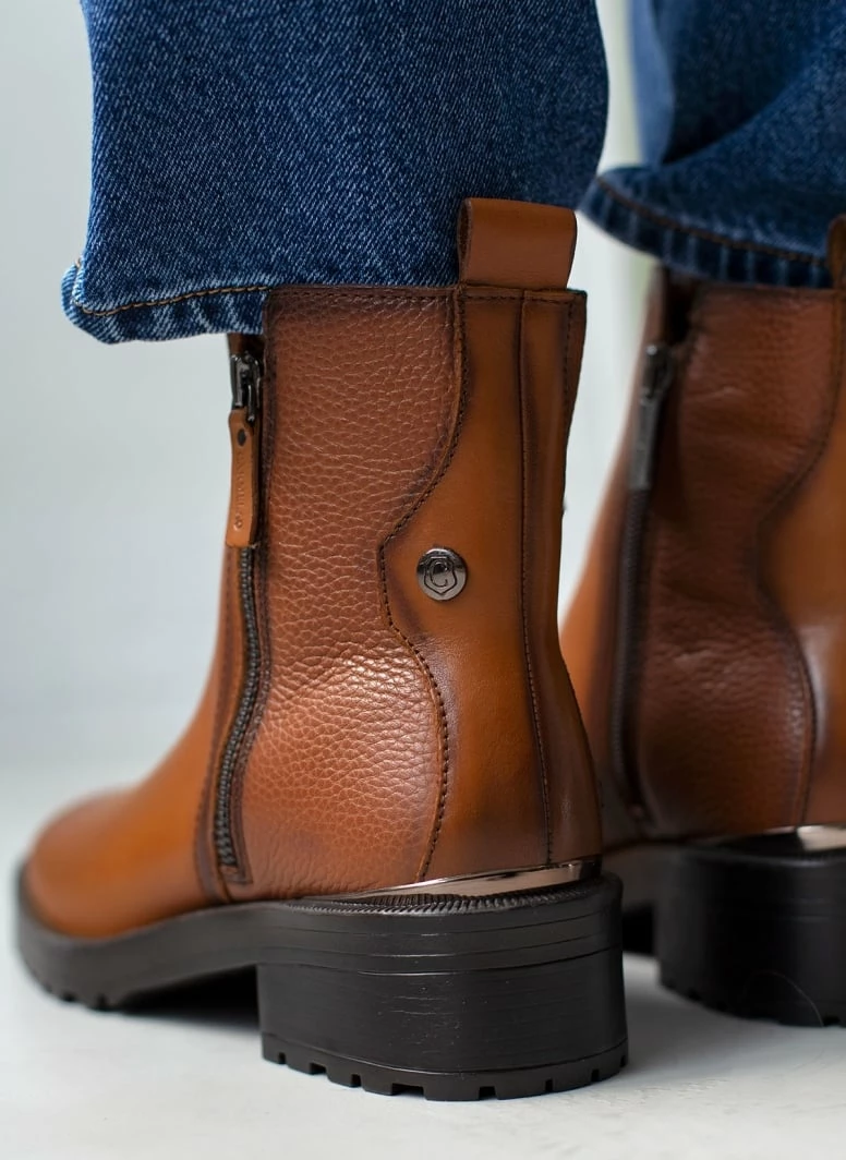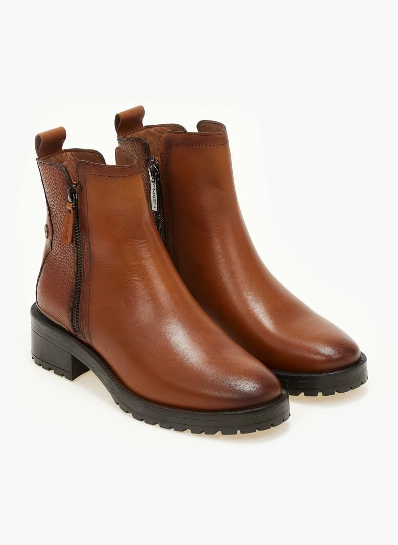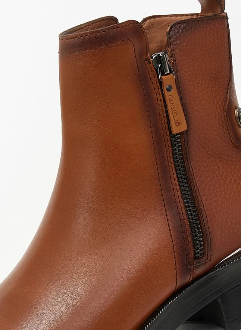 Μποτάκια δερμάτινα CARMELA με διακοσμητικό φερμουάρ στην εξωτερική τους πλευρά. Έχουν διακριτική μεταλλική λεπτομέρεια στο πίσω μέρος.