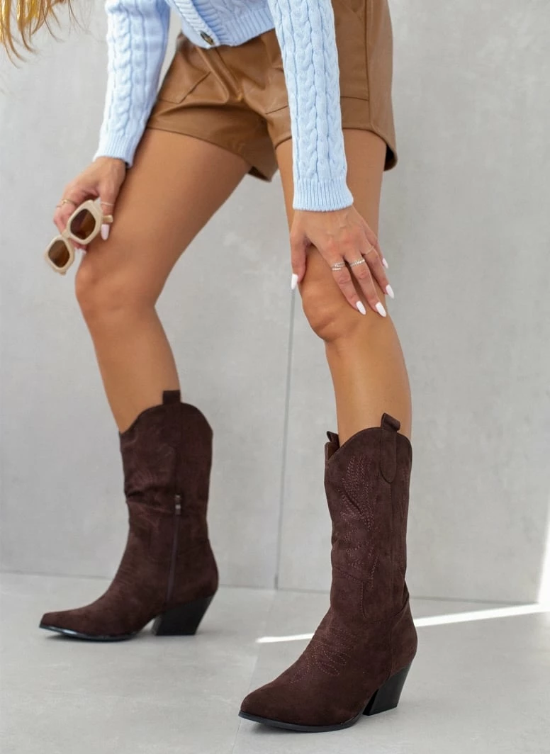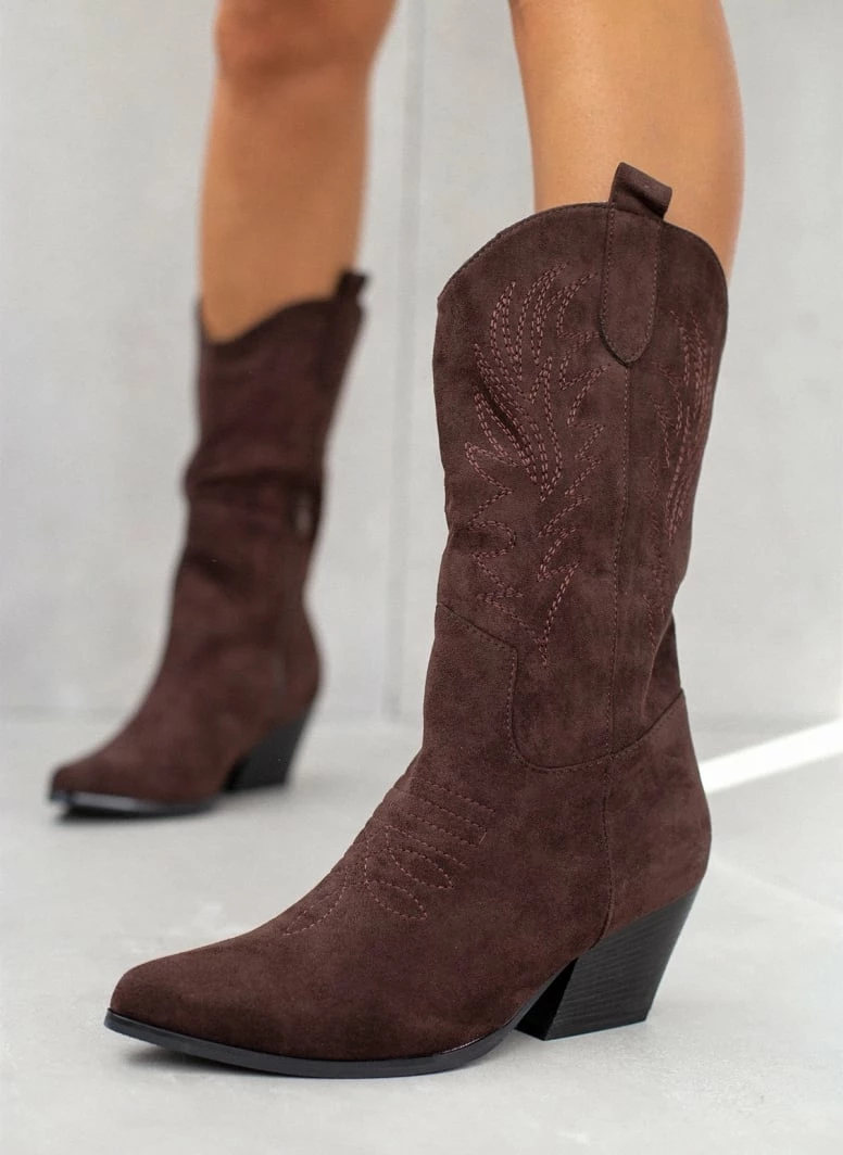 Μποτάκια cowboy suede με εξωτερικές ραφές και σχέδιο. Έχουν ξύλινο τακούνι. Οβάλ τελείωμα με θηλάκια.