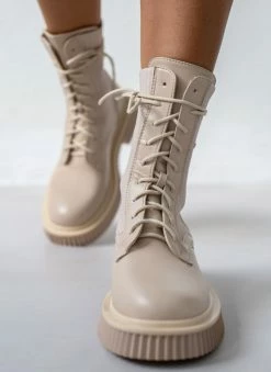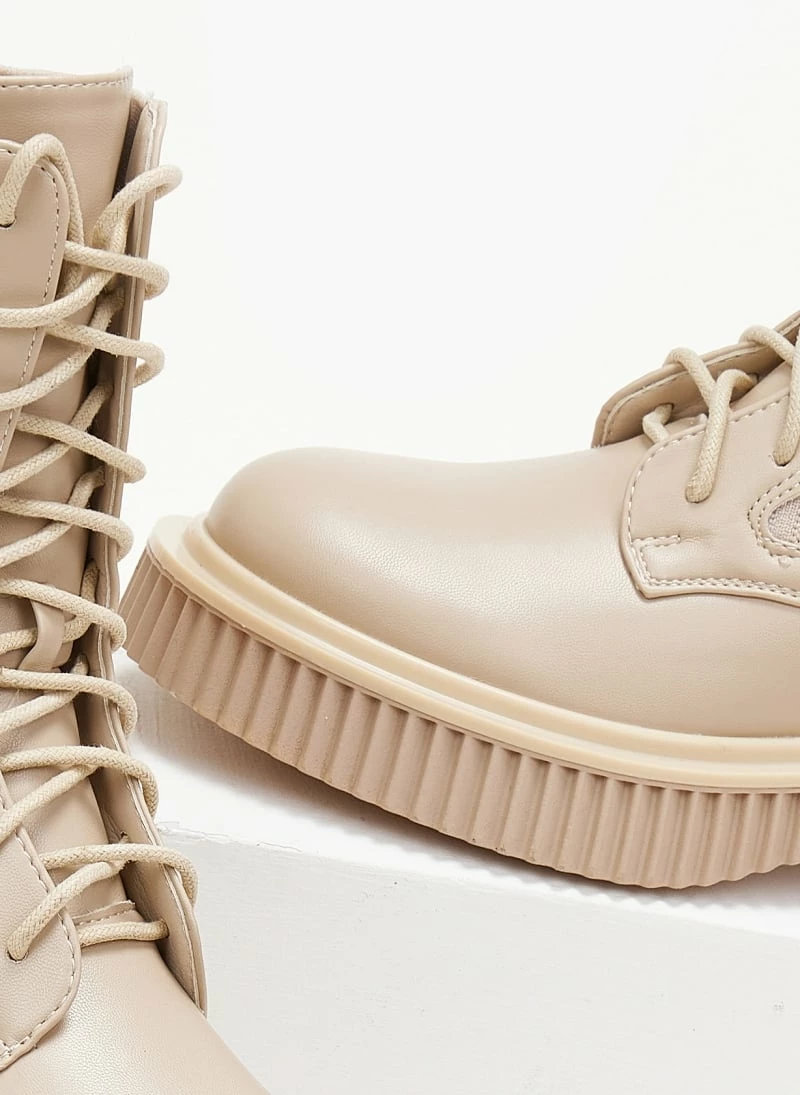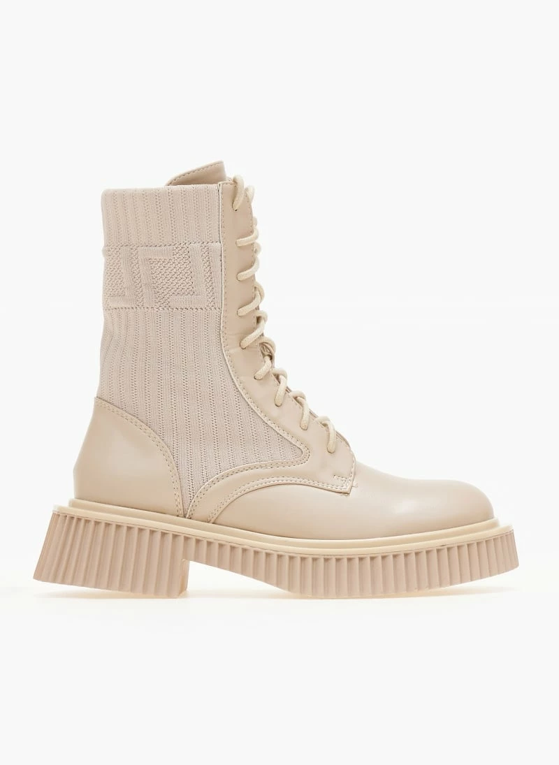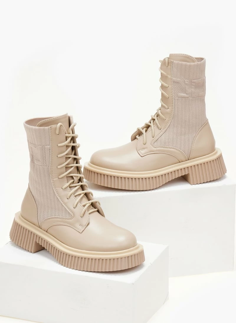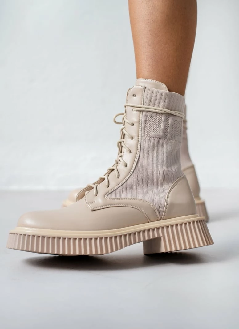 Μποτάκια με σχέδιο ελαστική κάλτσα στη γάμπα. Ιδιαίτερη σόλα με ανάγλυφες ρίγες. Στρογγυλή γραμμή.