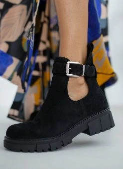 Μποτάκια suede αστραγάλου με chunky σόλα. Έχουν ανοίγματα στα πλαινά και αγκράφα. Στρογγυλή γραμμή.