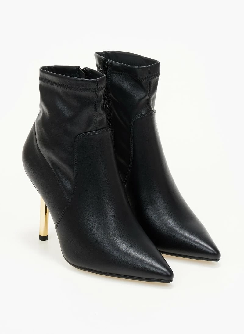 Μποτάκια μυτερά στο ύψος του αστραγάλου. Έχουν λεπτό μεταλλικό τακούνι. Κλείνουν με φερμουάρ. Κάνουν σχέδιο απο εξωτερικές ραφές.