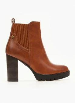 Μποτάκια αστραγάλου με ελαστικό τμήμα στην εξωτερική τους πλευρά. Έχουν κάθετη ραφή. Διακριτικό μεταλλικό διακοσμητικό στο πίσω μέρος. Ψηλό τετράγωνο τακούνι. Τρακτερωτή φιάπα. Στρογγυλή γραμμή.