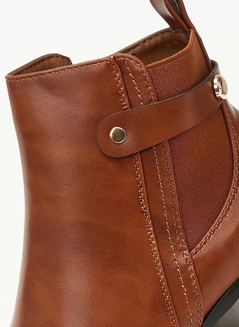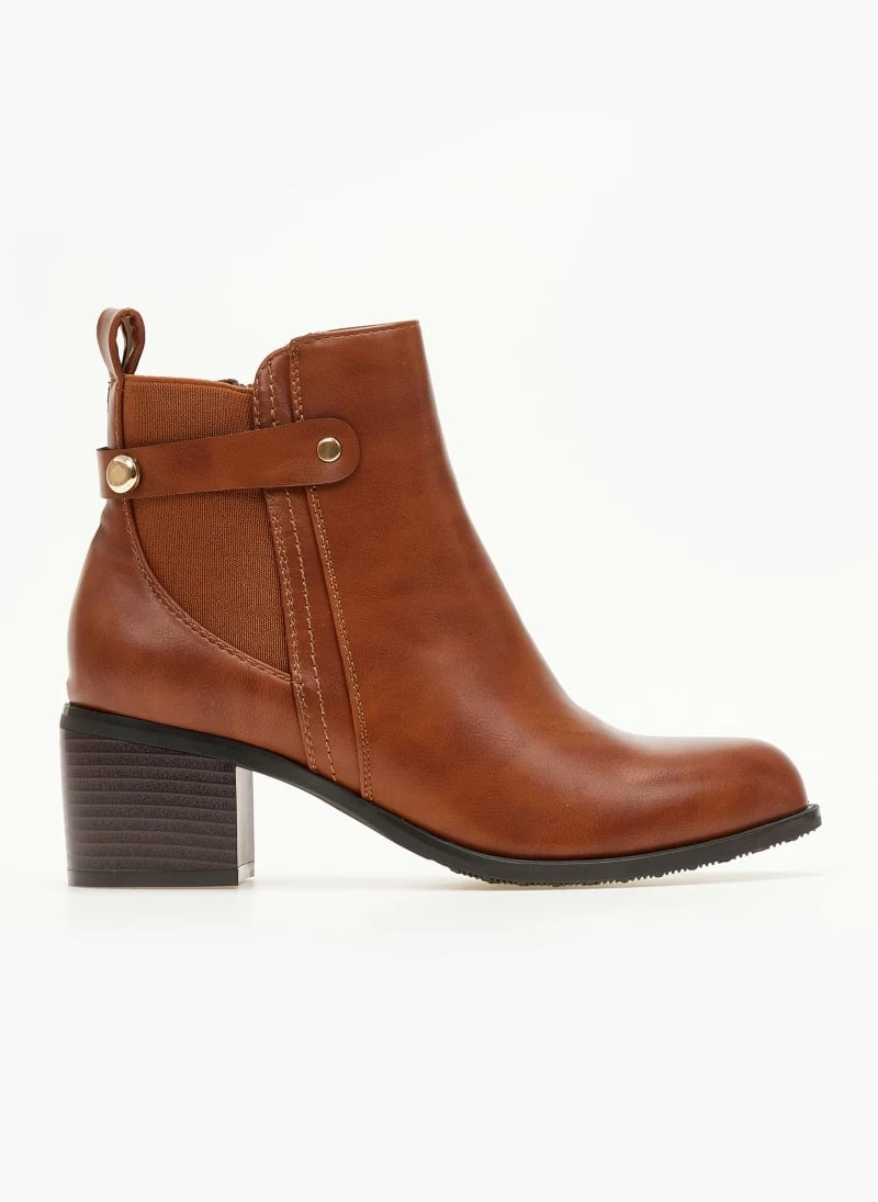 Μποτάκια αστραγάλου σε στρογγυλή γραμμή και χαμηλό τακούνι. Έχουν ελαστικό τμήμα στην εξωτερική τους πλευρά και διακοσμητική μεταλλική λεπτομέρεια.