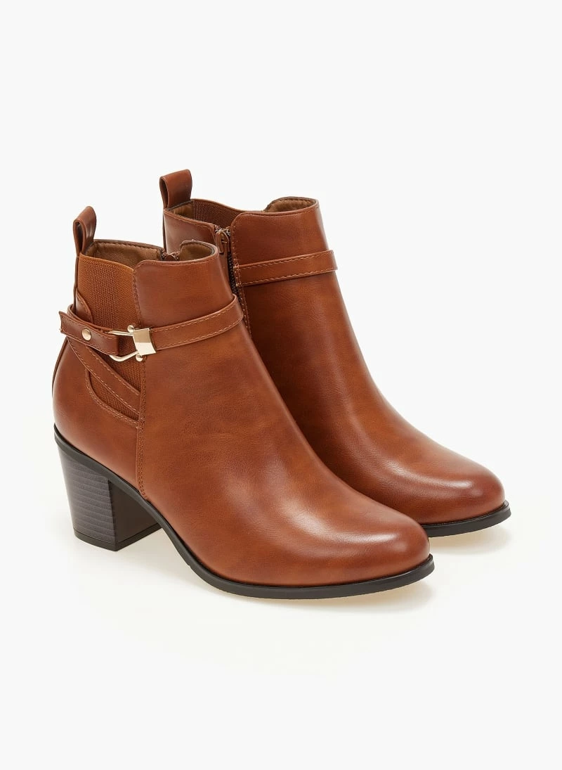 Μποτάκια αστραγάλου με τετράγωνο τακούνι. Έχουλ λεπτό ζωνάκι με μεταλλική λεπτομέρεια στο ύψος το αστραγάλου. Ελαστικό τμήμα στην εξωτερική τους πλευρά για καλύτερη εφαρμογή.