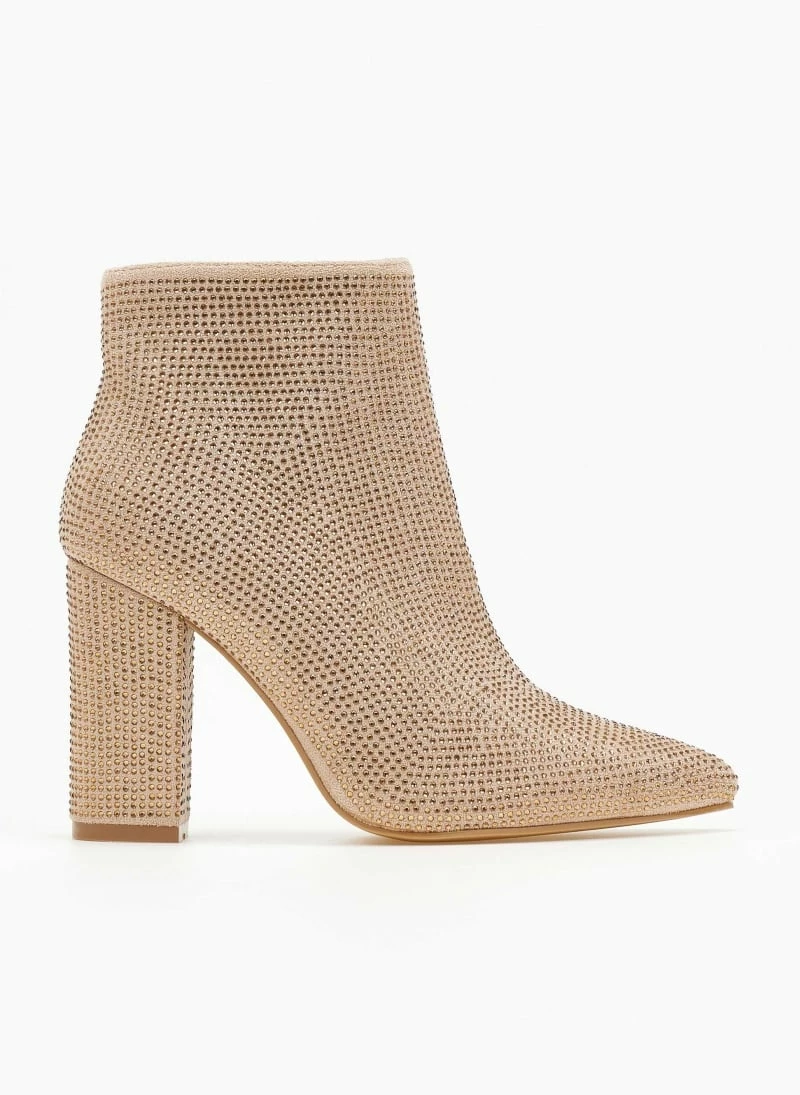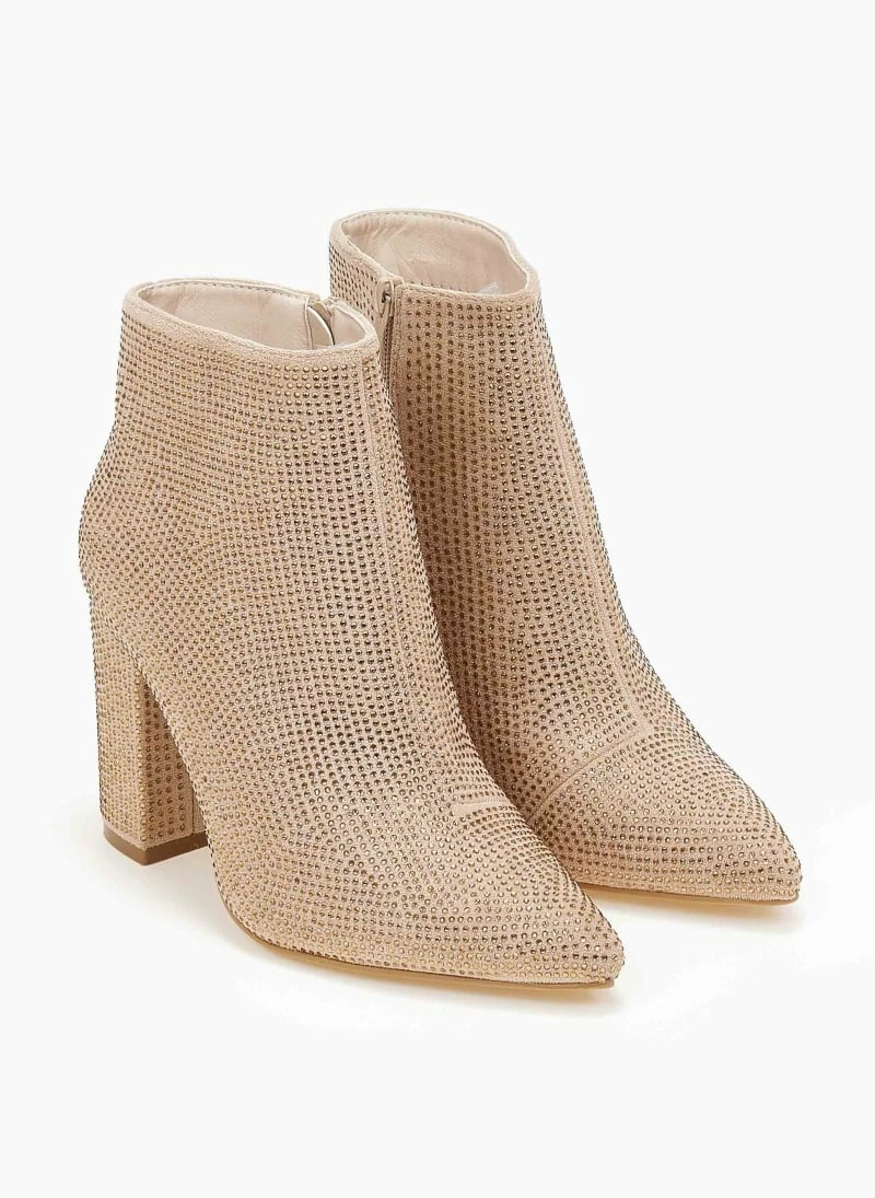 Μποτάκια αστραγάλου με strass. Έχουν ψηλό χοντρό τακούνι. Μυτερή φόρμα.