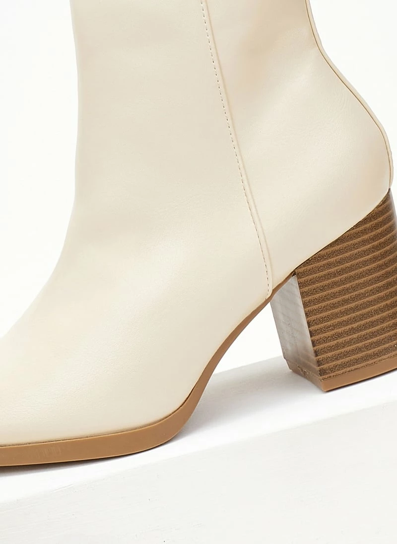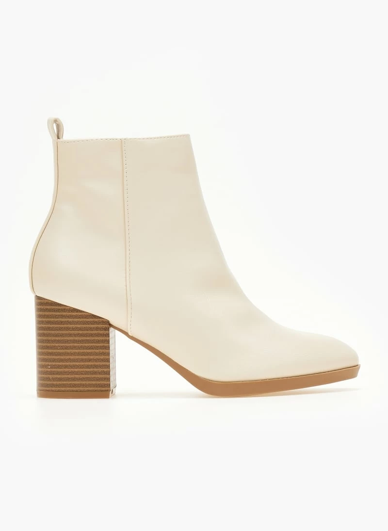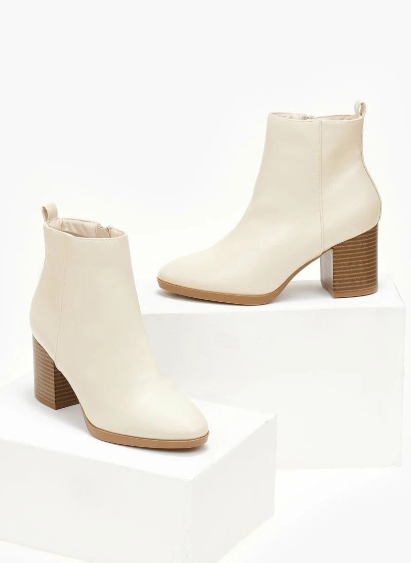 Μποτάκια αστραγάλου με τετράγωνο ξύλινο τακούνη. Έχουν κάθετη ραφή στο πλάι. Σόλα από λάστιχο.