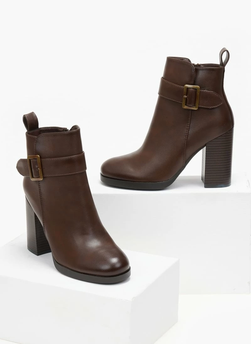 Μποτάκια αστραγάλου με ψηλό χοντρό τακούνι. Έχουν ζωνάκι με μεταλλική αγκράφα. Κάθετη ραφή στο πλάι.