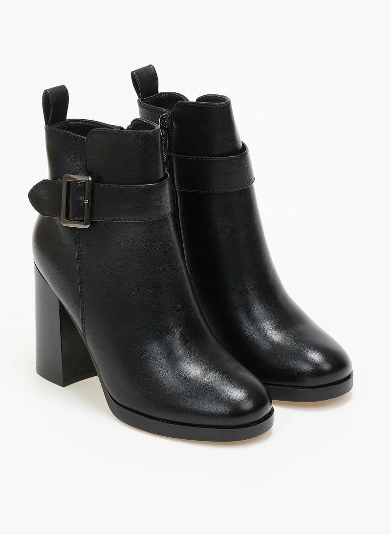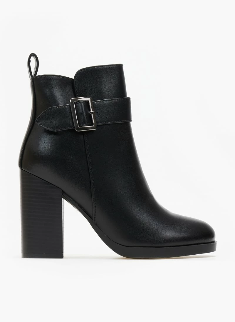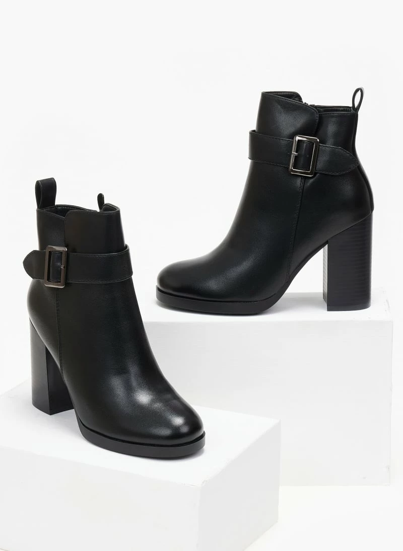 Μποτάκια αστραγάλου με ψηλό χοντρό τακούνι. Έχουν ζωνάκι με μεταλλική αγκράφα. Κάθετη ραφή στο πλάι.