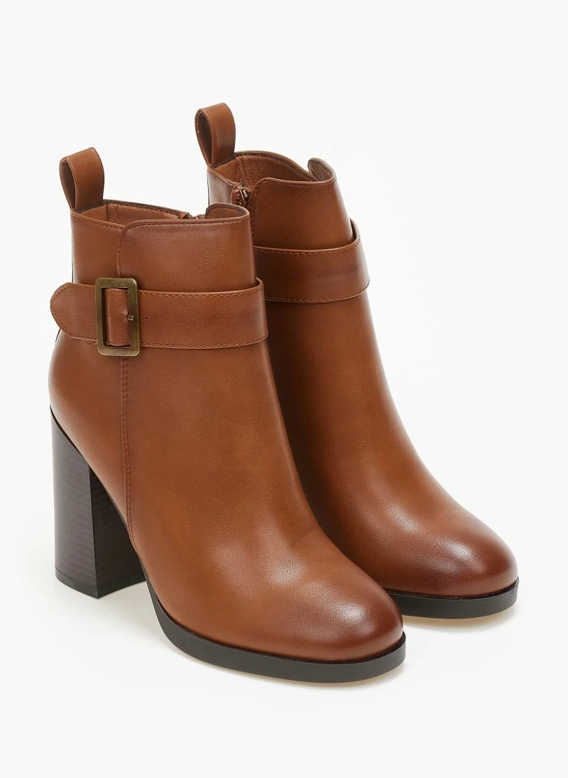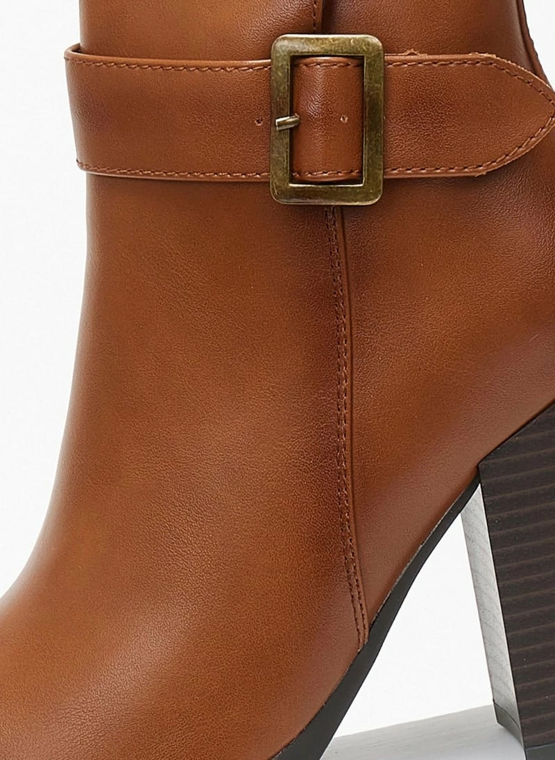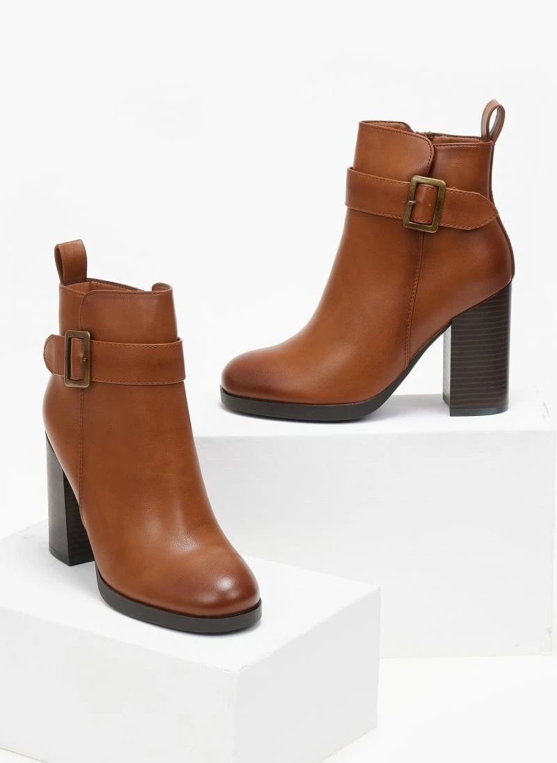 Μποτάκια αστραγάλου με ψηλό χοντρό τακούνι. Έχουν ζωνάκι με μεταλλική αγκράφα. Κάθετη ραφή στο πλάι.