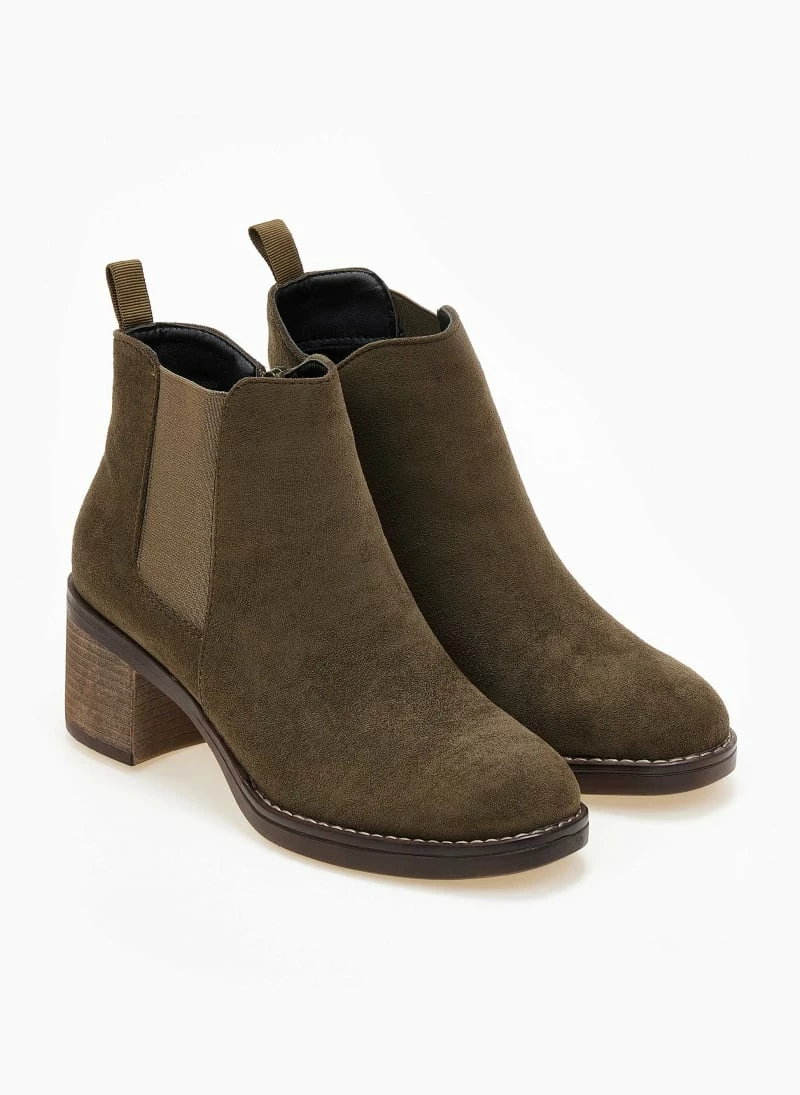 Suede μποτάκια αστραγάλου σε στρογγυλή γραμμή. Έχουν λάστιχο στην εξωτερική τους πλευρά. Εξωτερική ραφή περιμετρικά της σόλας. Χαμηλό τετράγωνο τακούνι.