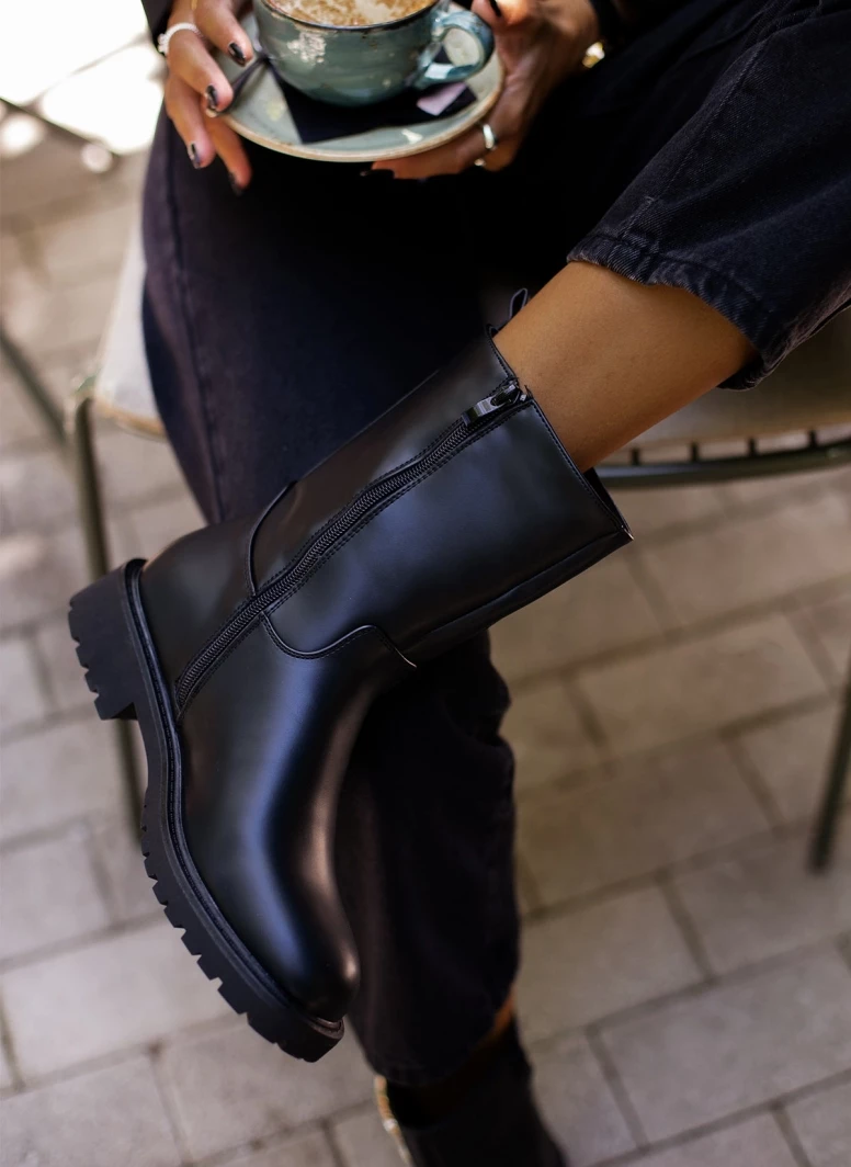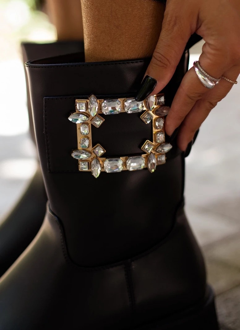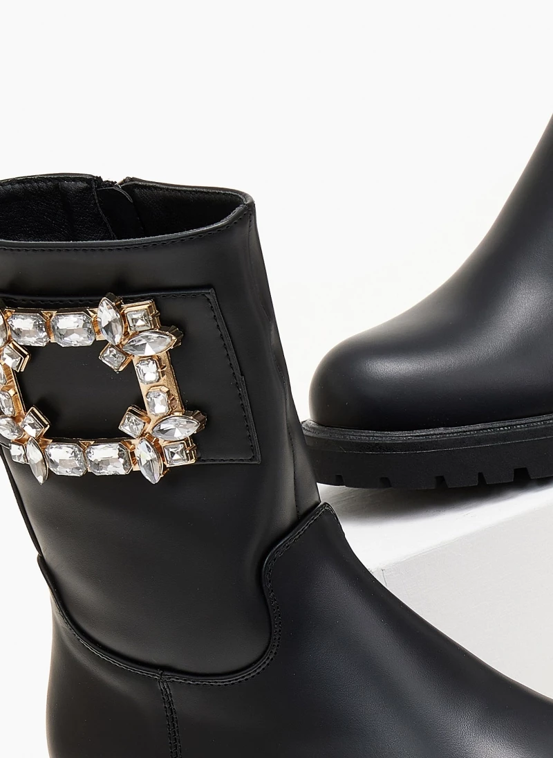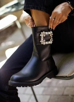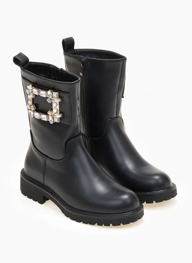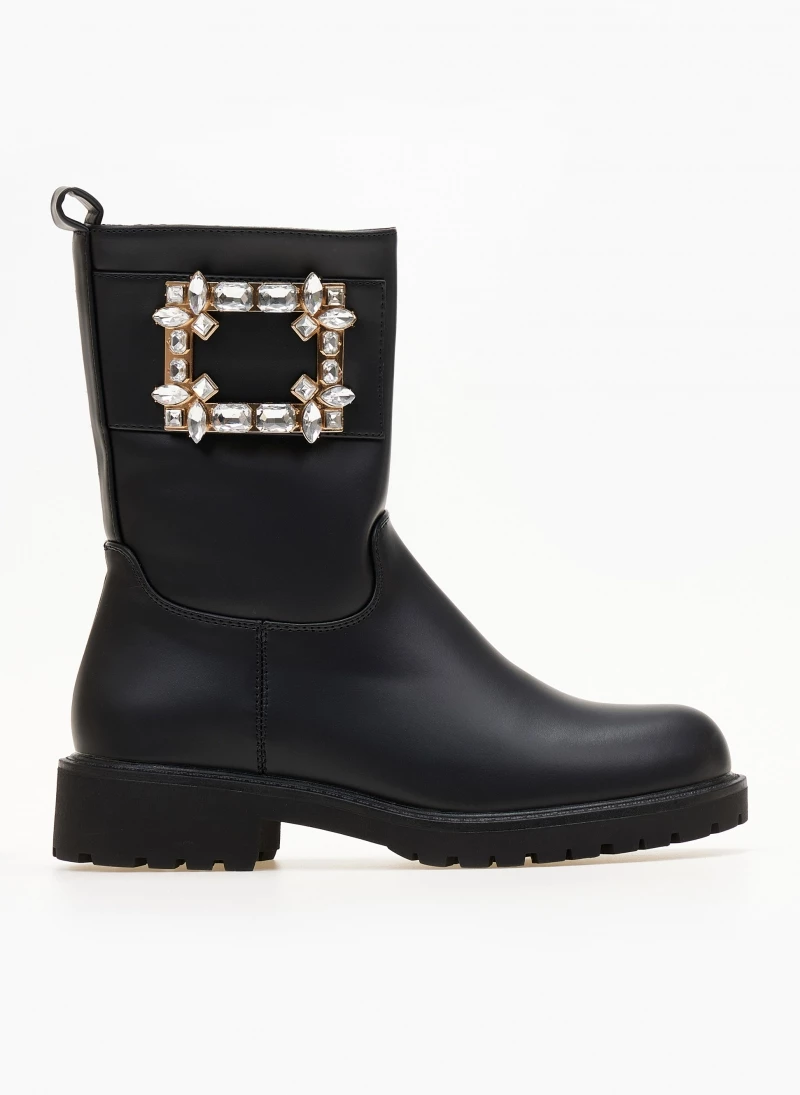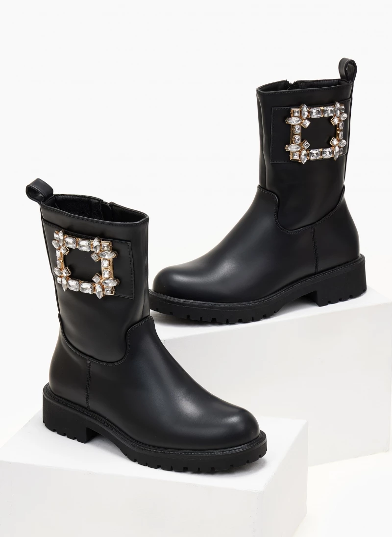 Μποτάκια casual σε στρογγυλή γραμμή. Έχει τετράγωνο διακοσμητικό με πέτρες στο πλάι. Τρακτερωτή σόλα.