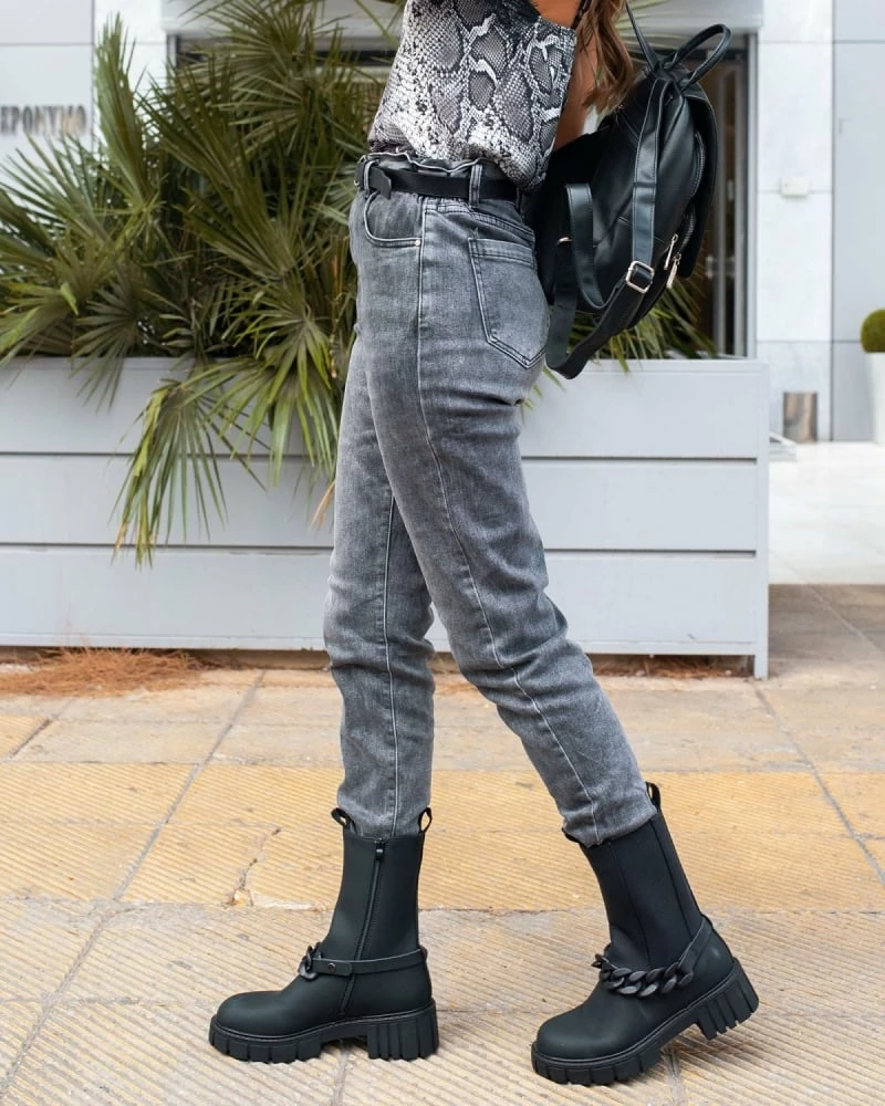 Ματ μποτάκια με ψηλή σόλα με σχέδιο.Έχουν αποσπώμενο λουράκι με ματ αλυσίδα στο ίδιο χρώμα.