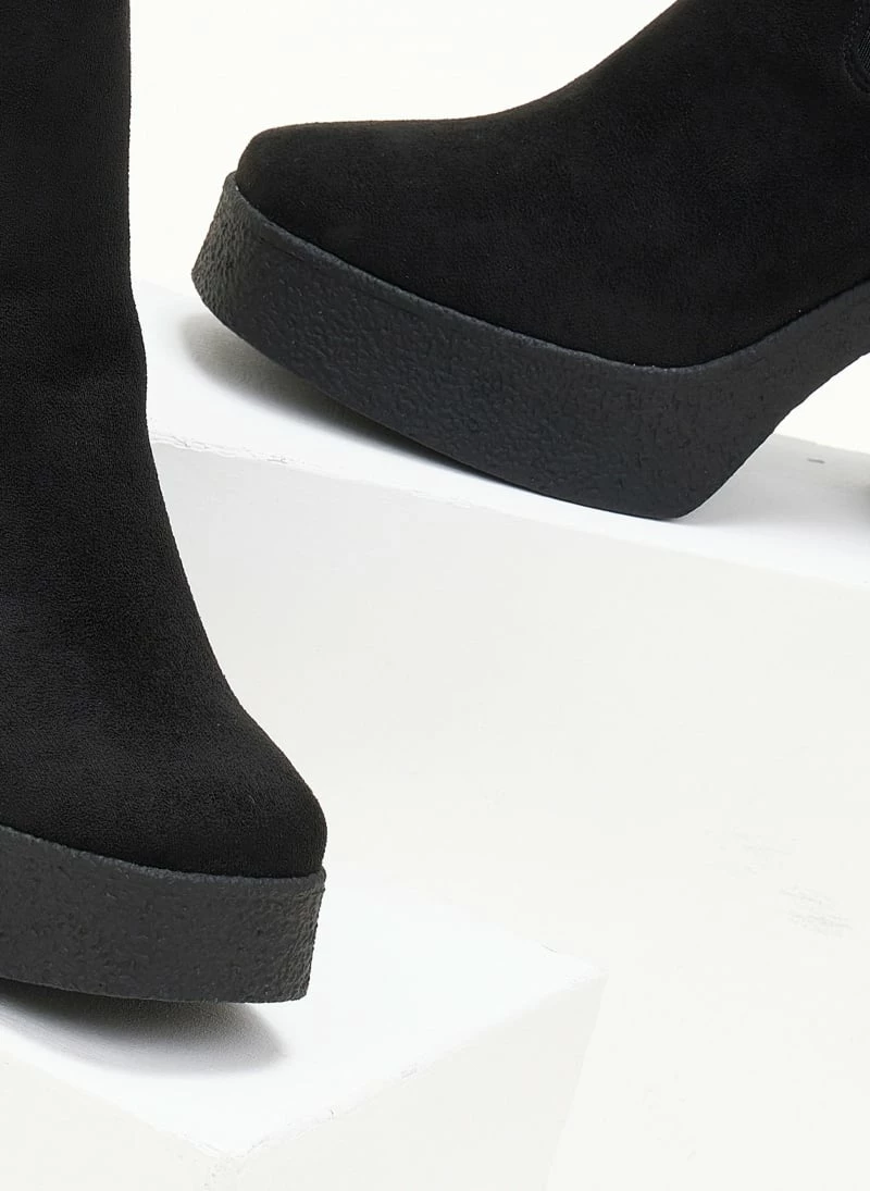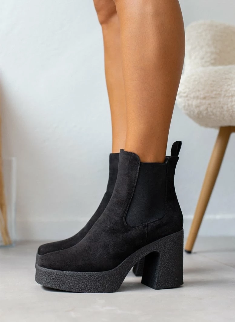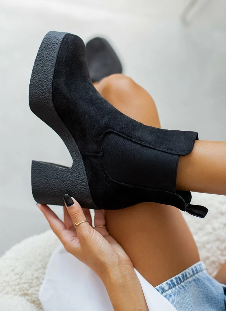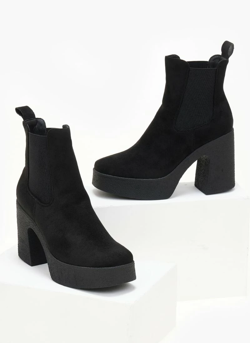 Μποτάκια suede με φιάπα και ψηλό χοντρό τακούνι από κρεπ. Έχουν λάστιχο στο πλάι για καλύτερη εφαρμογή. Στρογγυλή γραμμή.