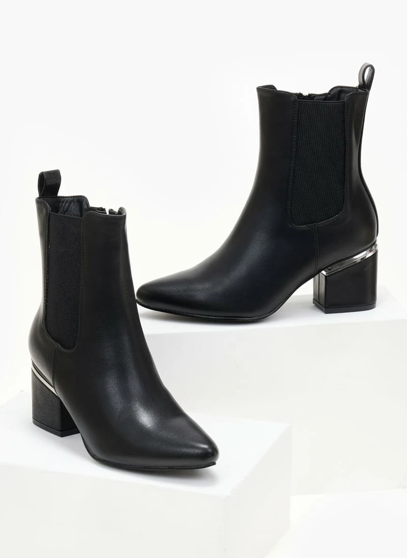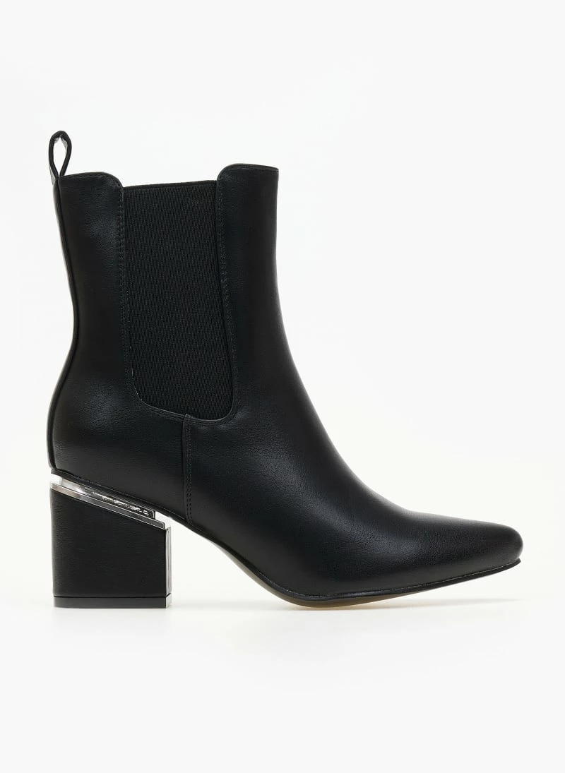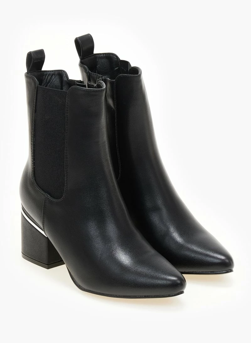Μποτάκια μυτερά chelsea με χαμηλό χοντρό τακούνι. Έχουν λάστιχο στο πλάι. Διαθέτουν μεταλλική λεπτομέρεια στο τακούνι.