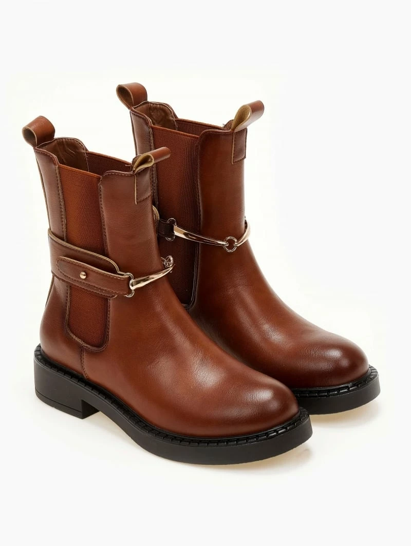 Μποτάκια φλατ με ζωνάκι και μεταλλικό διακοσμητικό στο ύψος του αστραγάλου. Έχουν λάστιχο στα πλαινά για καλύτερη εφαρμογή. Θηλάκια στο τελείωμα. Εφέ εξωτερική ραφή περιμετρικά της σόλας. Στρογγυλή γραμμή.