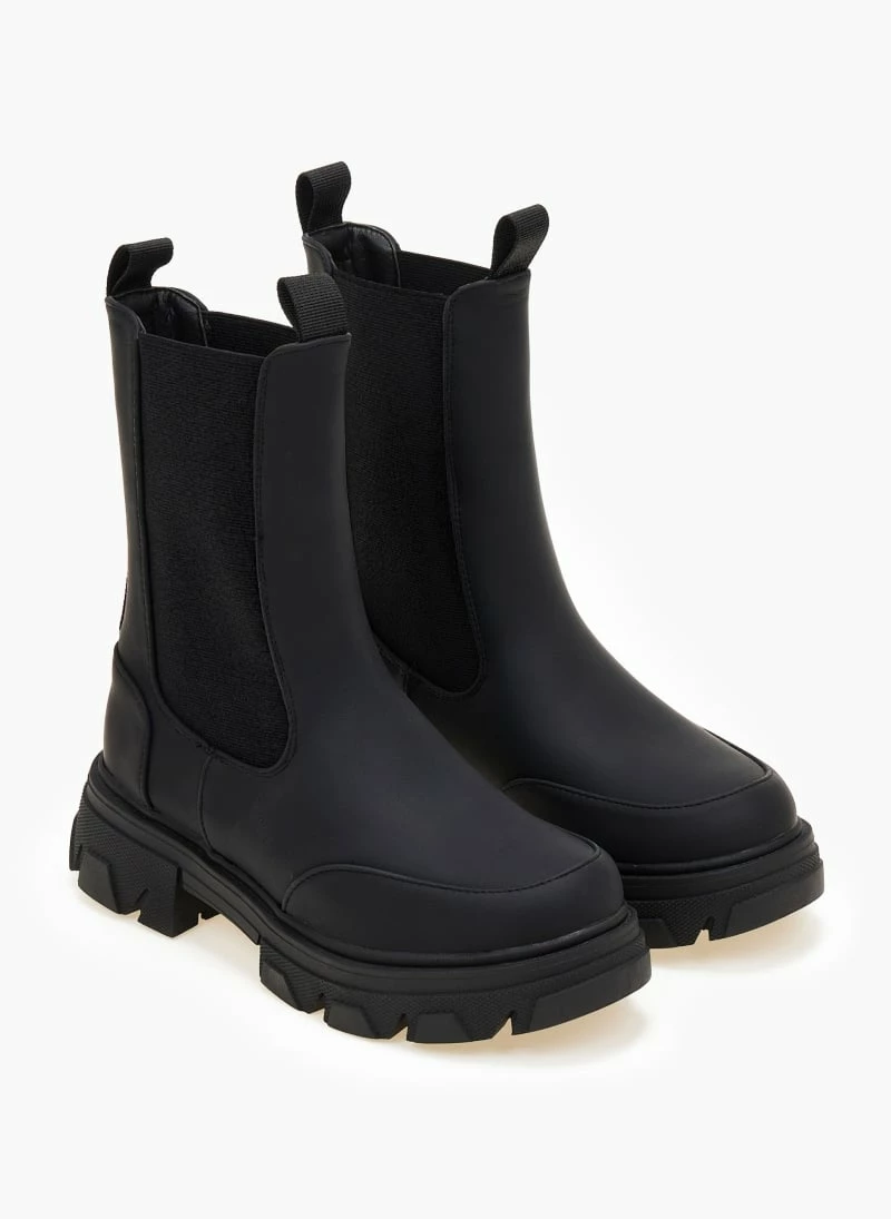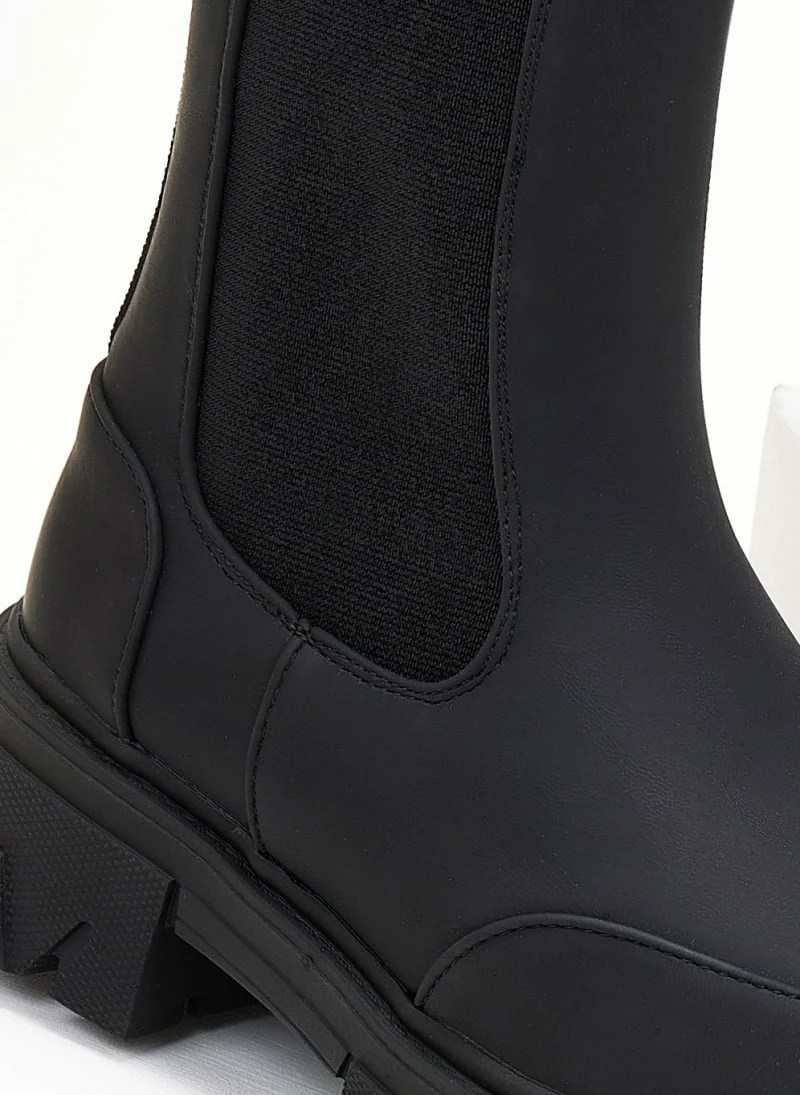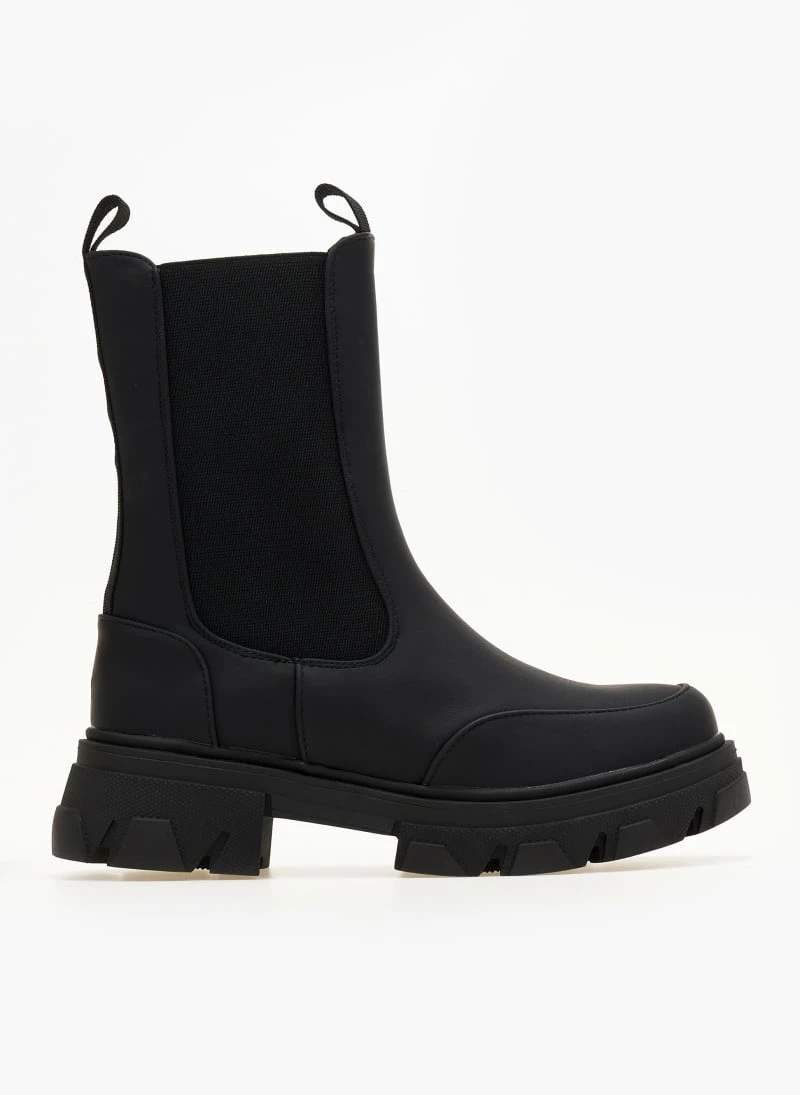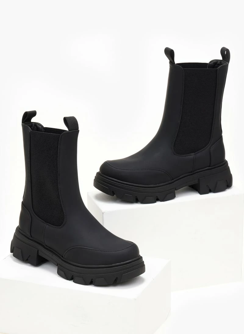 Ματ chelsea μποτάκια με chunky σόλα με σχέδιο. Έχουν λάστιχο και στις δύο πλευρές και διακοσμητικά θηλάκια στο τελείωμα.