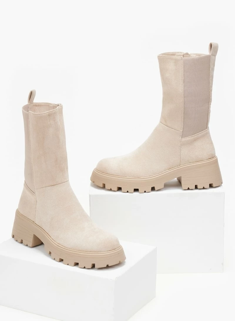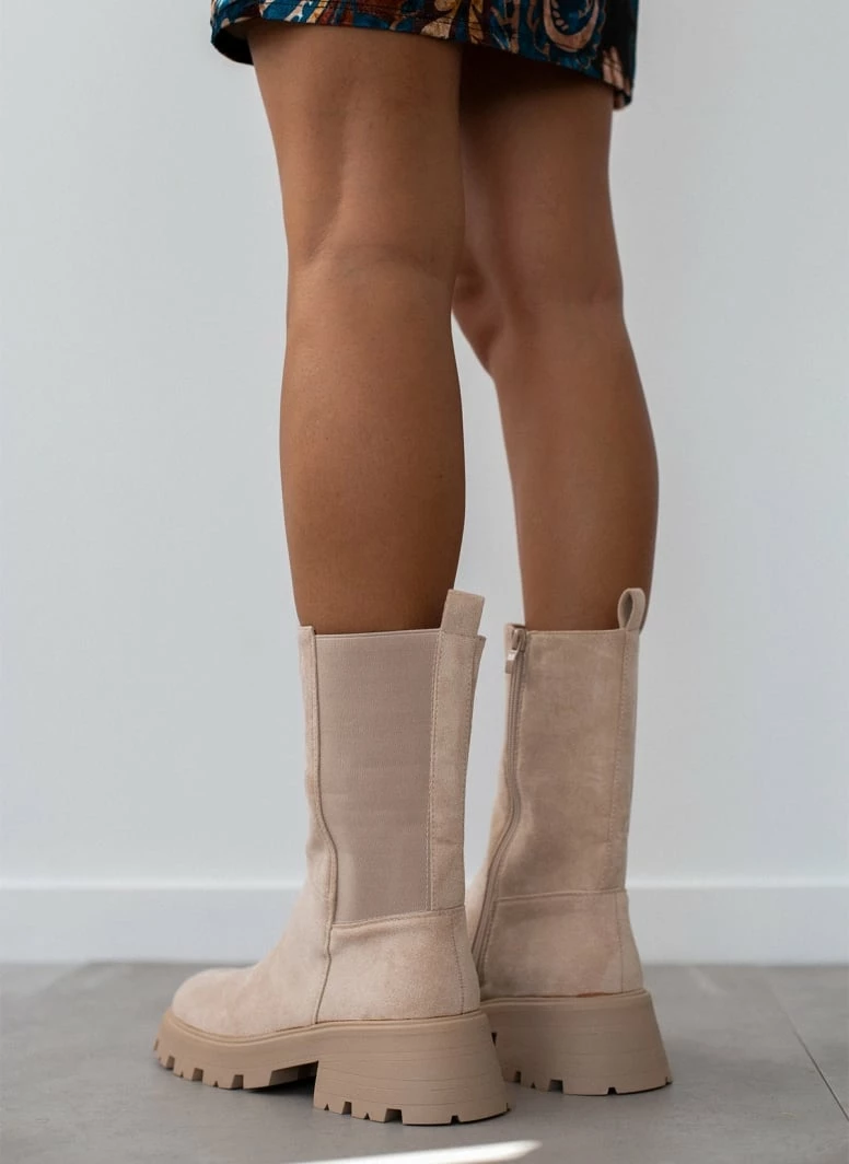 Μποτάκια chelsea suede με chunky σόλα. Έχουν φερμουάρ στην εσωτερική τους πλευρά. Στρογγυλή γραμμή.