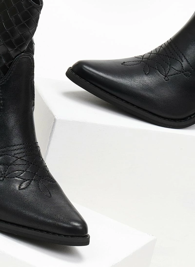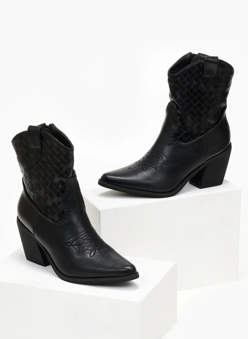 Western μυτερά μποτάκια με ψηλό χοντρό τακούνι. Έχουν ανάγλυφο pattern ψάθα στο επάνω μέρος. Σχέδιο με ραφές στο κουτεπιέ.