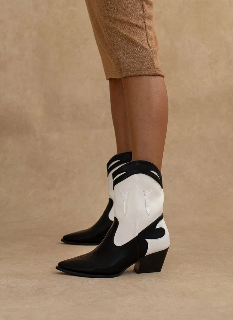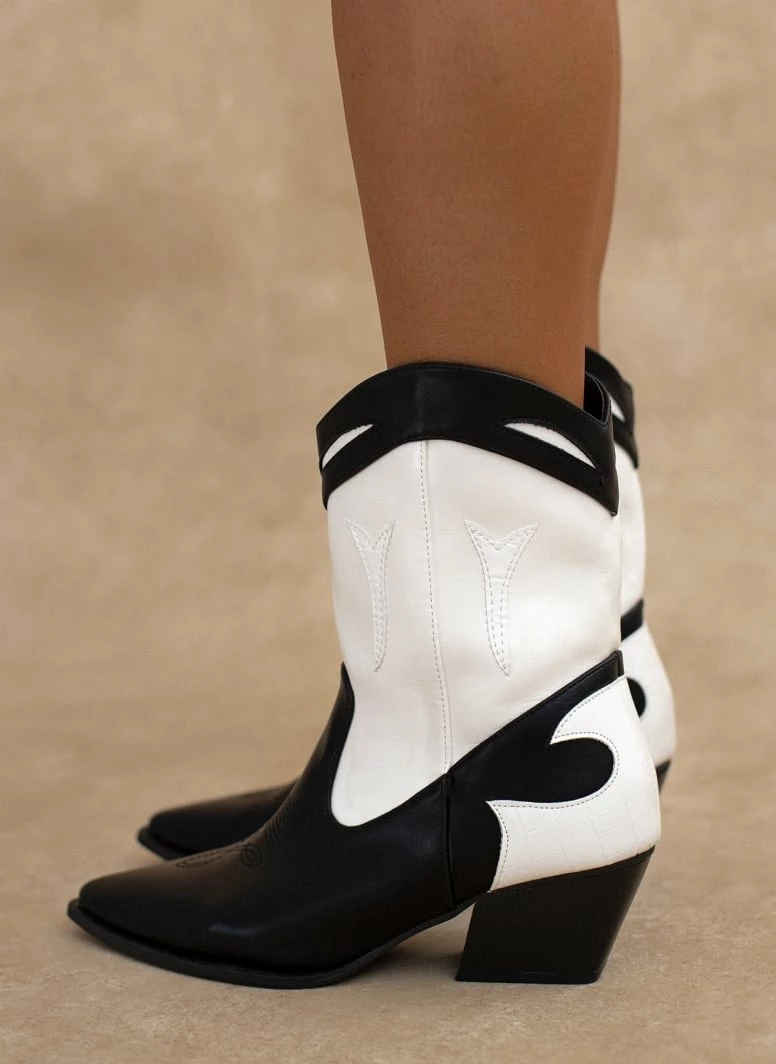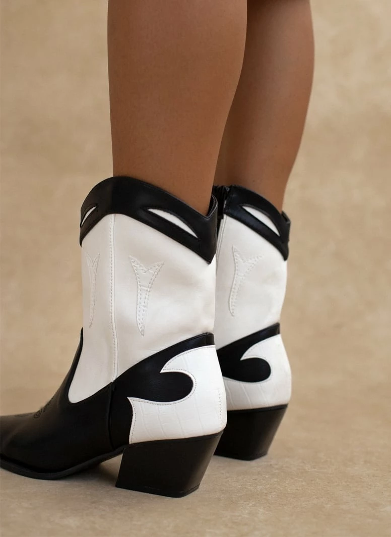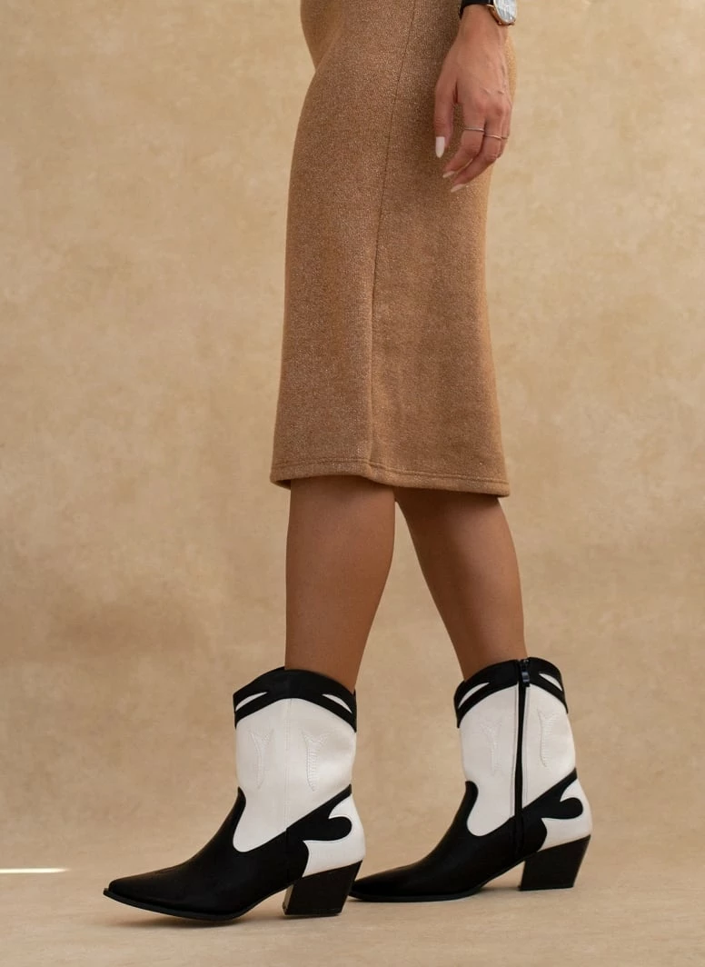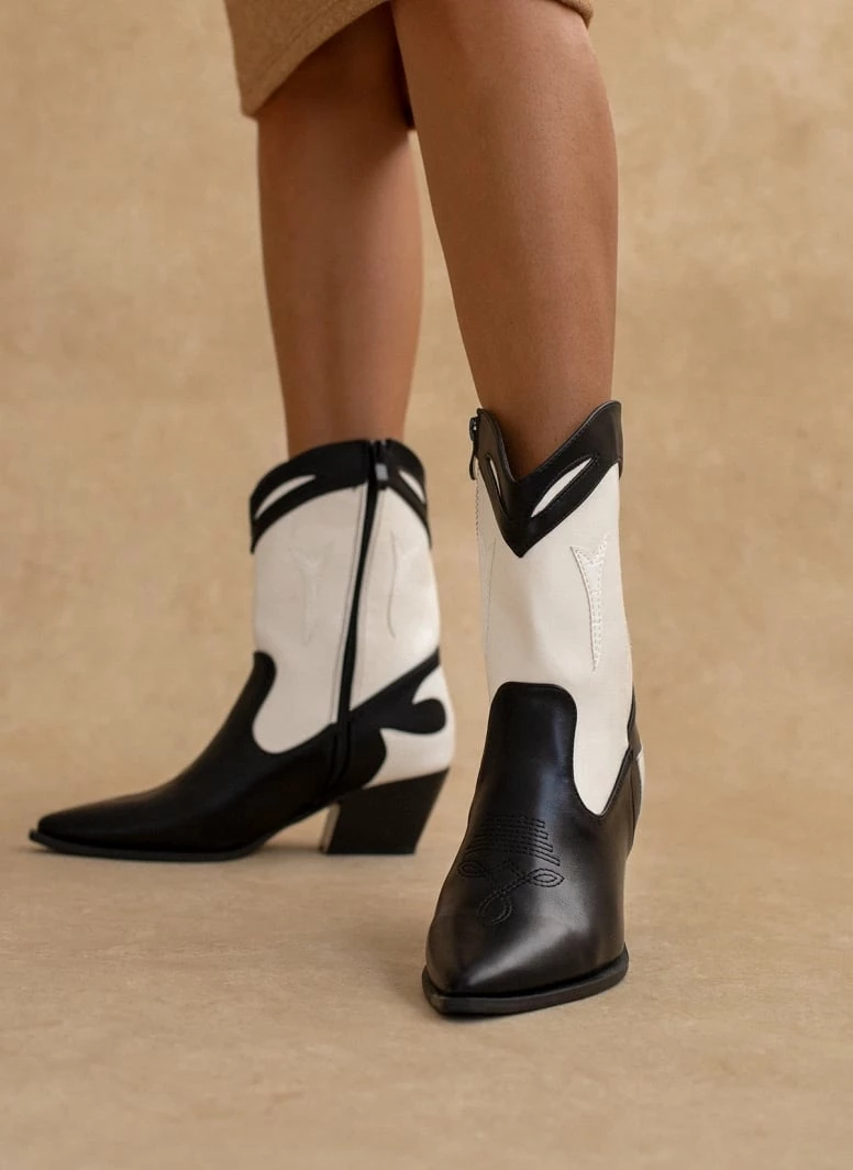 Μποτάκια western με χαμηλό τακούνι. Έχουν σχέδιο με ραφές και διχρωμία. Λεπτομέρεια κροκό στο πίσω μέρος. Το τελείωμα είναι οβάλ.