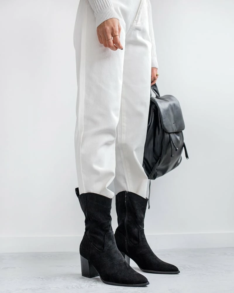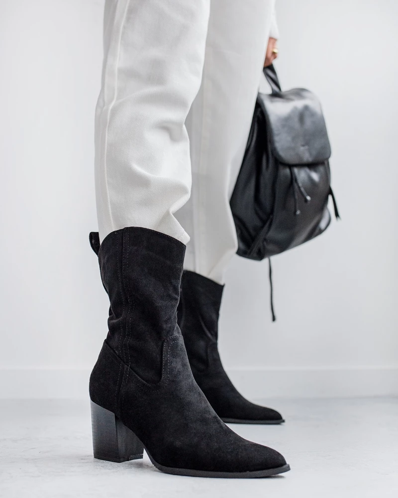 Suede westwern υτερά μποτάκια.Έχουν τετράγωνο τακούνι.Το τελείωμα είναι οβάλ.