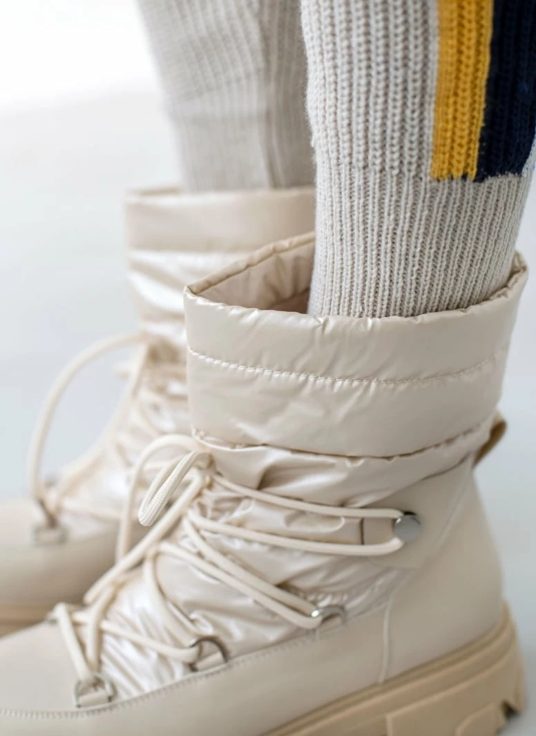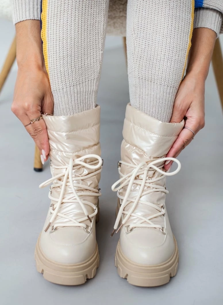 Μποτάκια apres ski με χιαστί κορδόνια. Έχουν γυαλιστερό ύφασμα με καπιτονέ σχέδιο στη γάμπα. Chunky σόλα με σχέδιο.