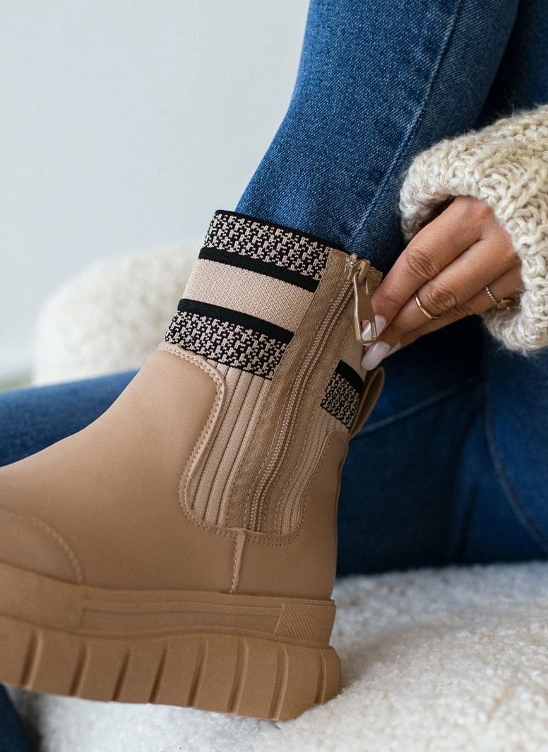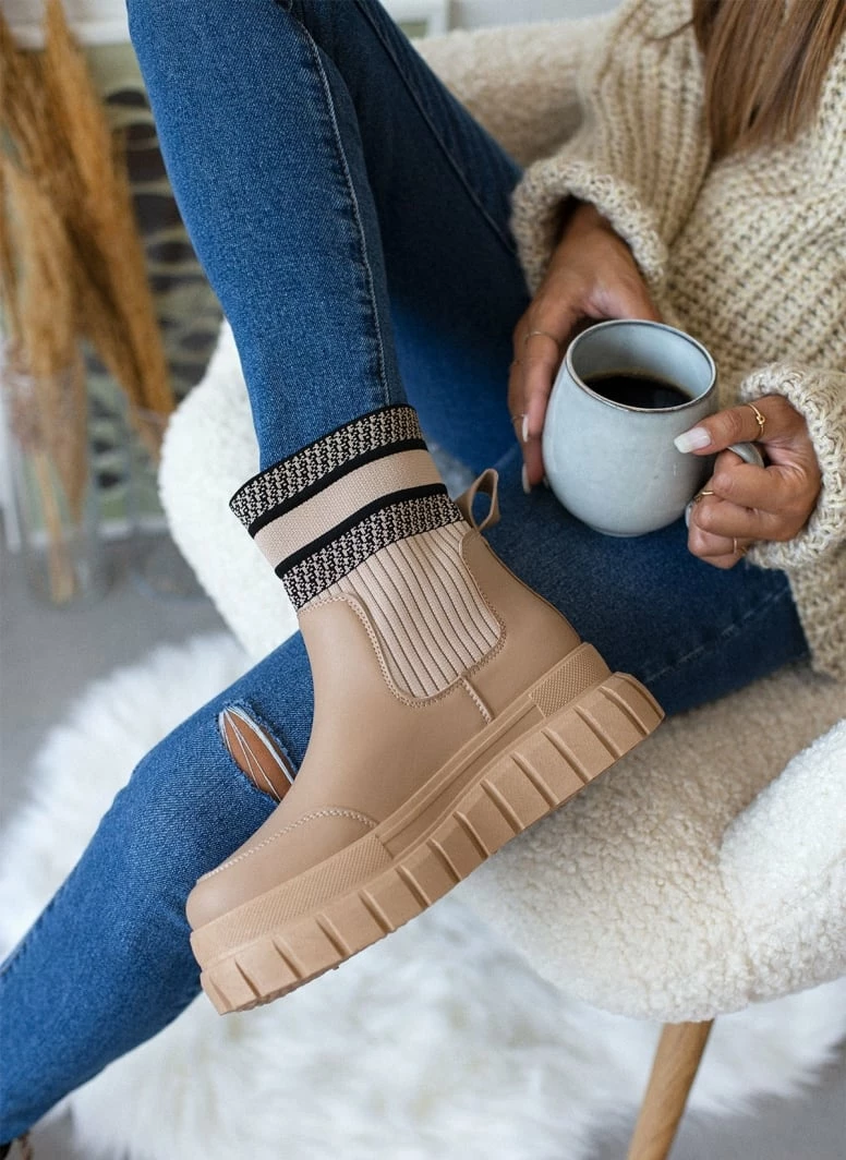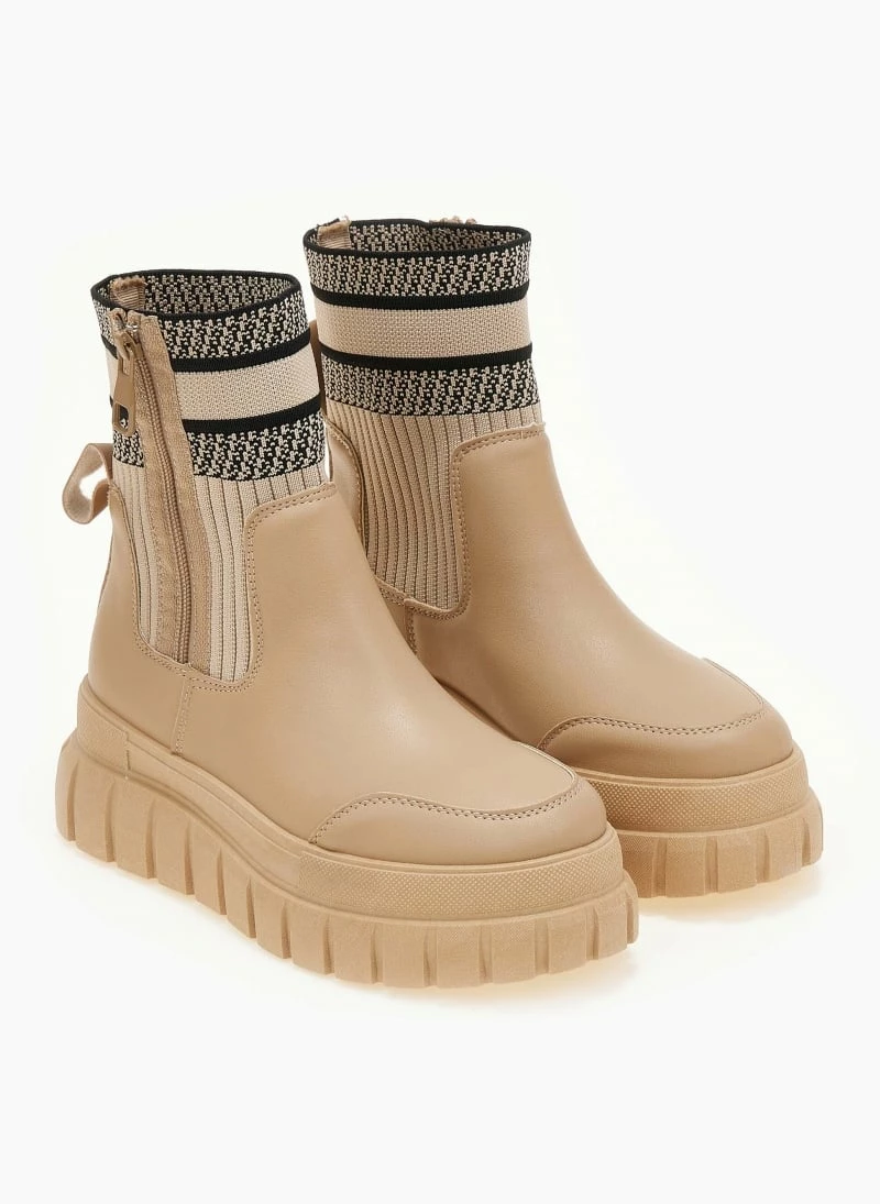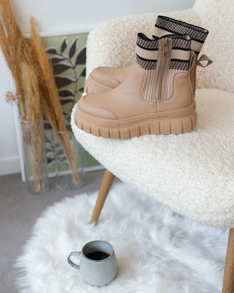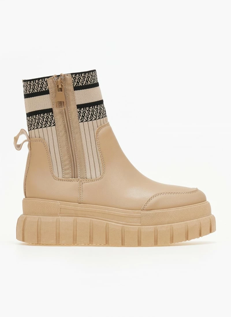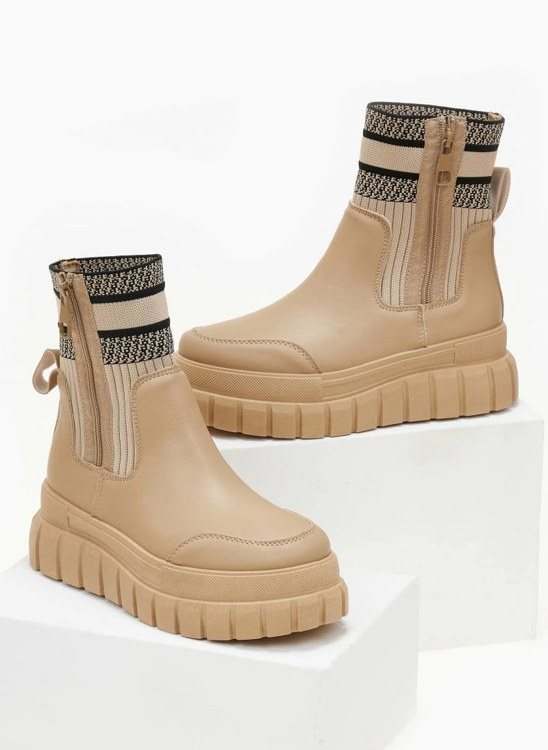 Μποτάκια κάλτσα με διχρωμία. Έχουν chunky διπλή σόλα. Διαθέτουν διακοσμητικό φερμουάρ στην εξωτερική πλευρά. Θηλάκι στο πίσω μέρος.