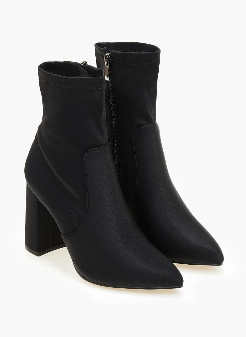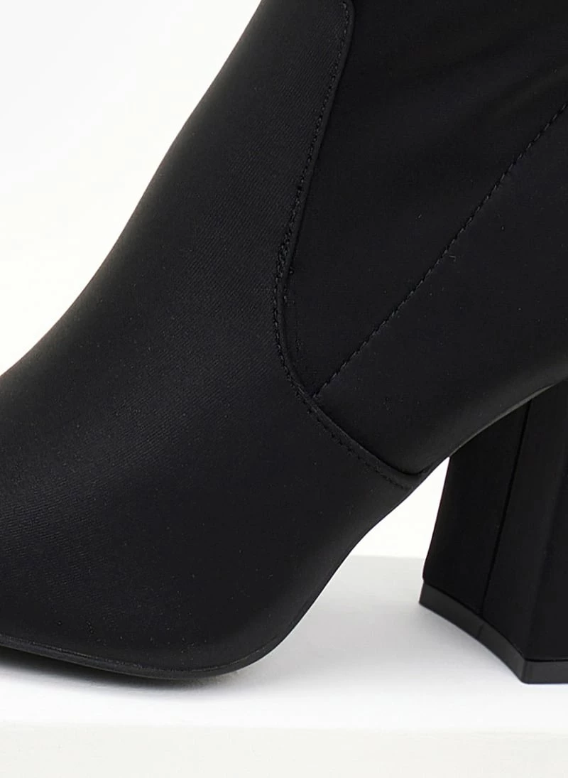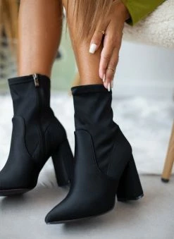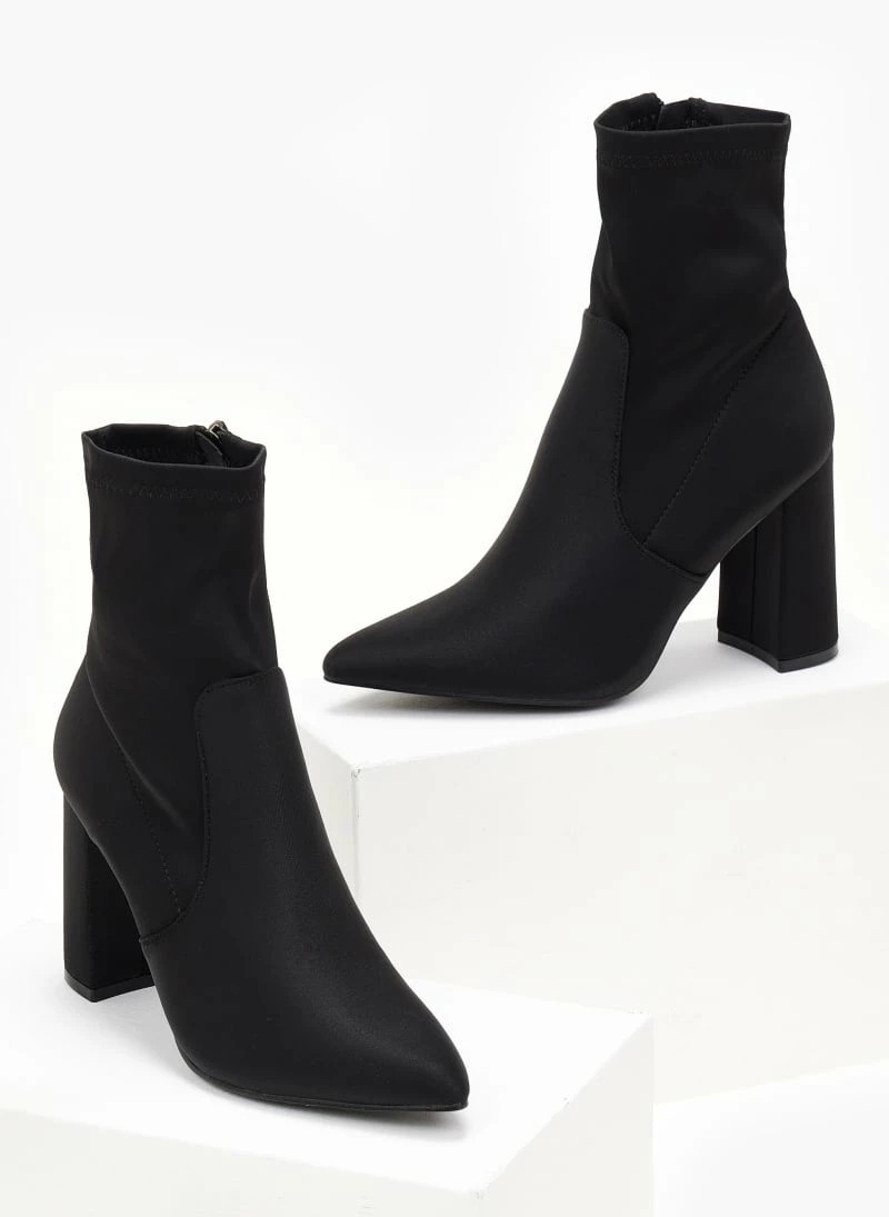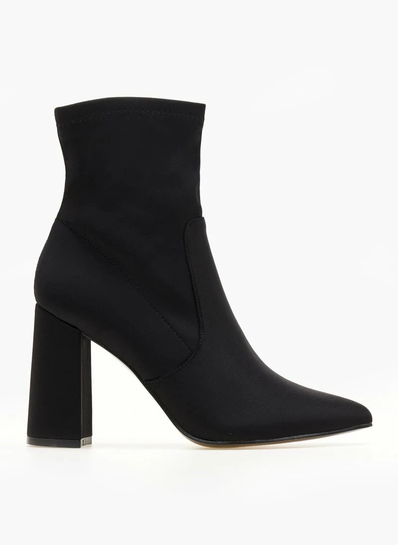 Μποτάκια κάλτσα από ελαστικό ύφασμα. Μυτερή φόρμα. Ψηλό τετράγωνο τακούνι.