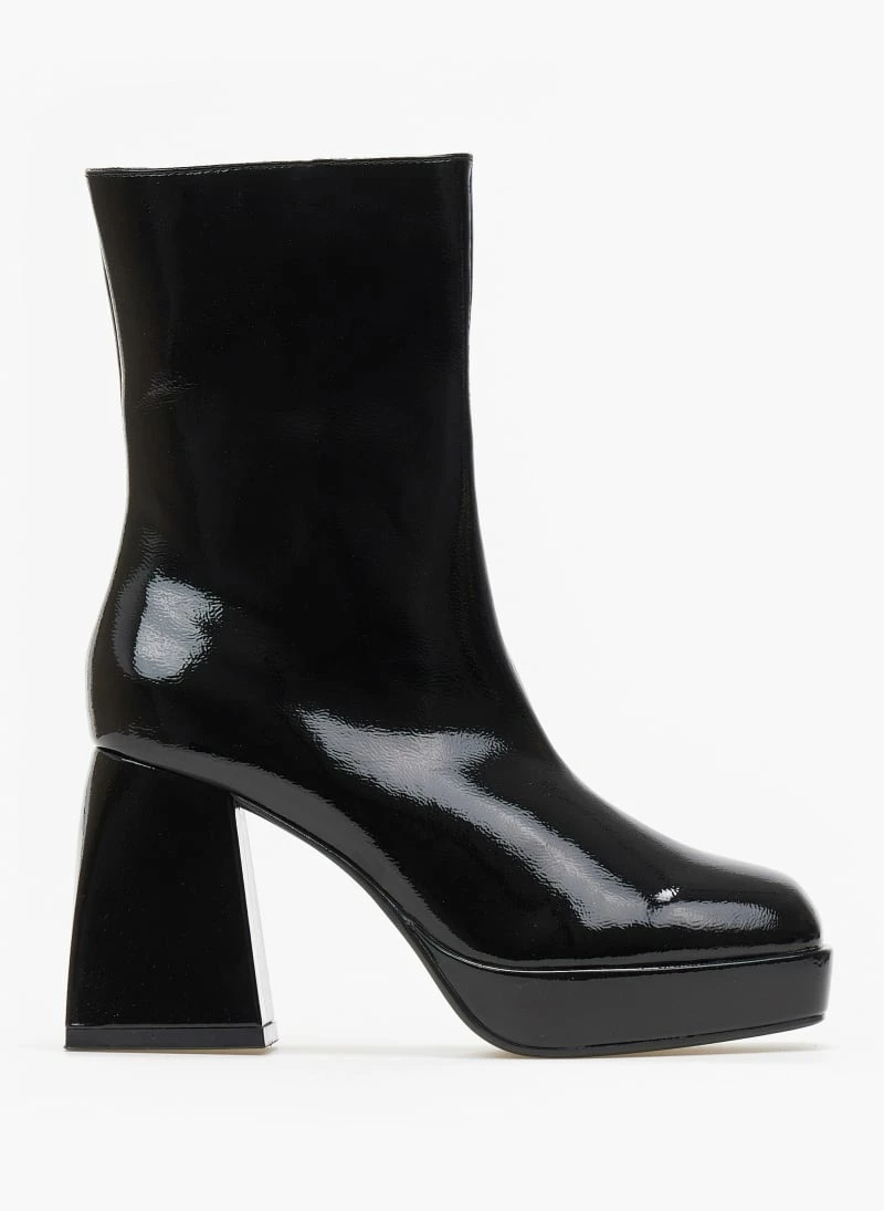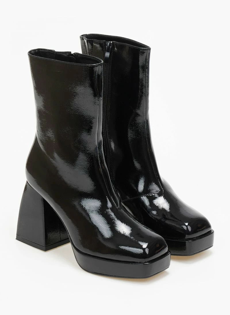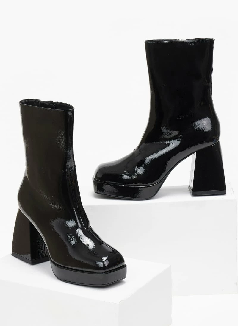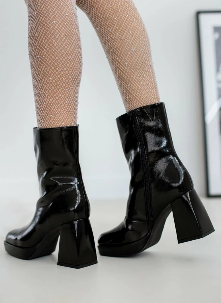 Μποτάκια λουστρίνι με φιάπα. Έχουν καρέ γραμμή. Ιδιαίτερο χοντρό τακούνι. Διακριτικό άνοιγμα με λάστιχο στο επάνω μέρος.