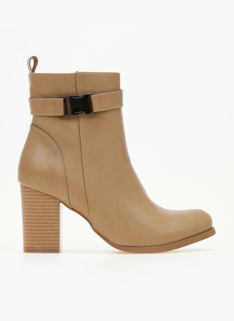 Μποτάκια σε στρογγυλή γραμμή. Έχουν ζωνάκι με μεταλλικό διακοσμητικό. ψηλό χοντρό τακούνι.