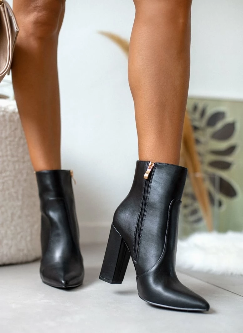 Μυτερά μποτάκια με ψηλό τετράγωνο τακούνι. Έχουν μεταλλικό v cut άνοιγμα στην εξωτερική τους πλευρά.