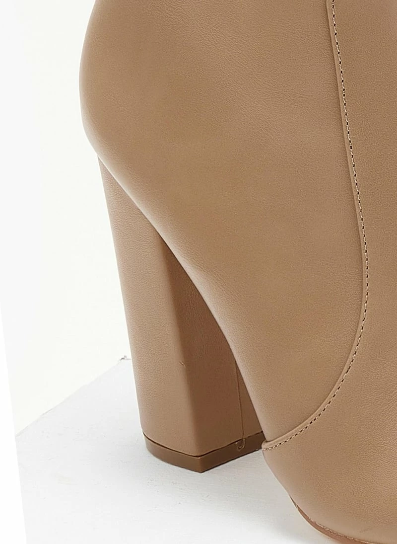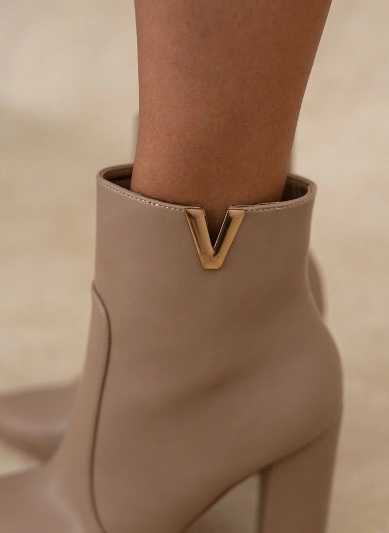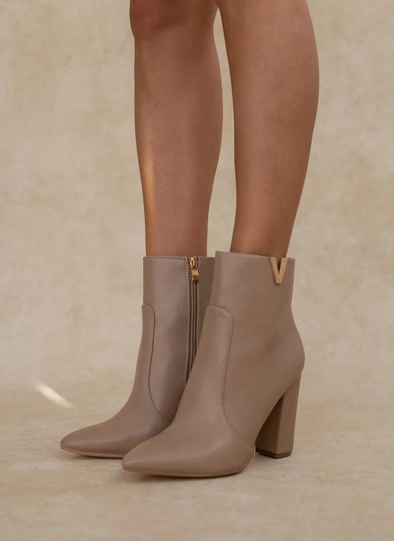 Μυτερά μποτάκια με ψηλό τετράγωνο τακούνι. Έχουν μεταλλικό v cut άνοιγμα στην εξωτερική τους πλευρά.