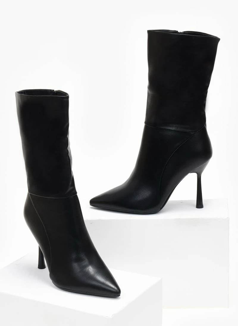 Μποτάκια μυτερά με λεπτό τακούνι. Έχουν ιδιαίτερο σχέδιο στην εξωτερική τους πλευρά.