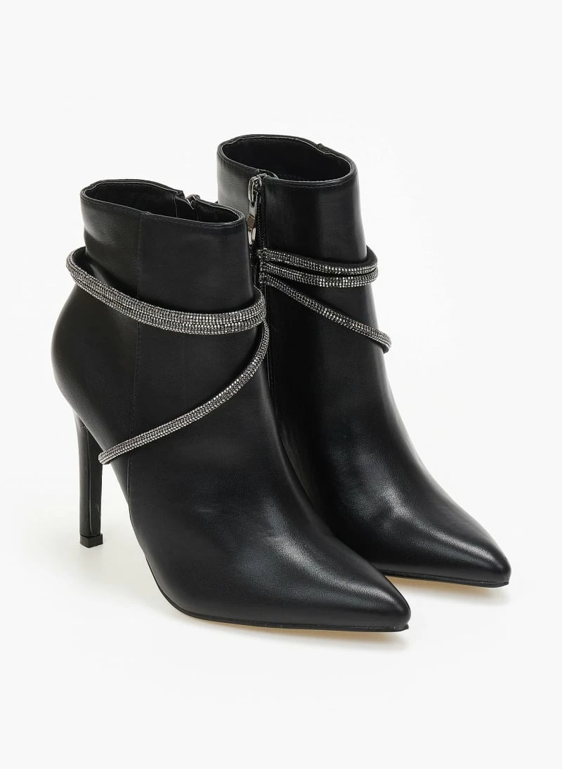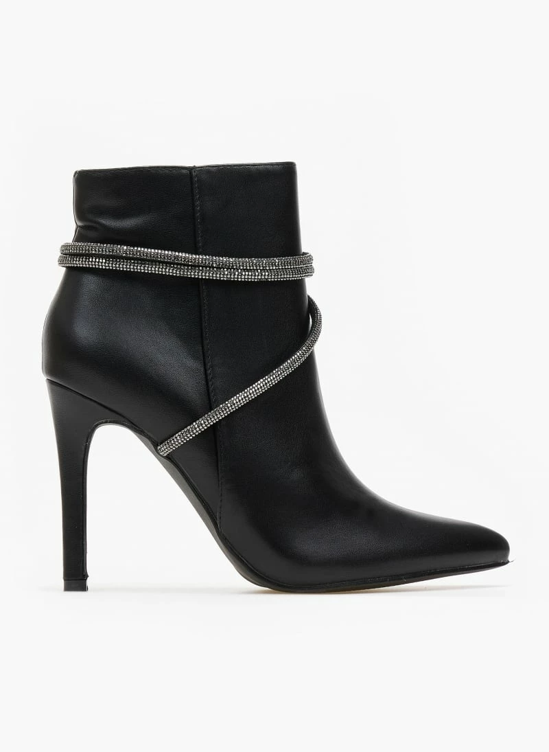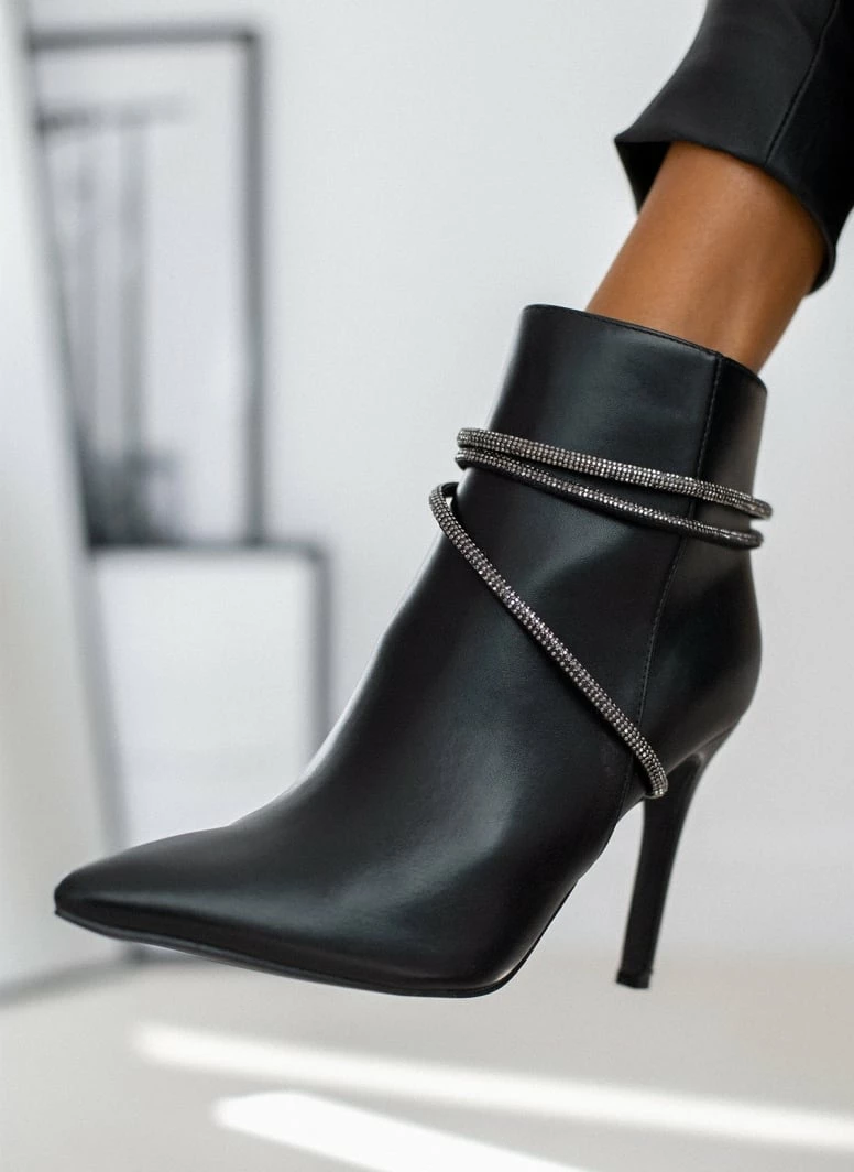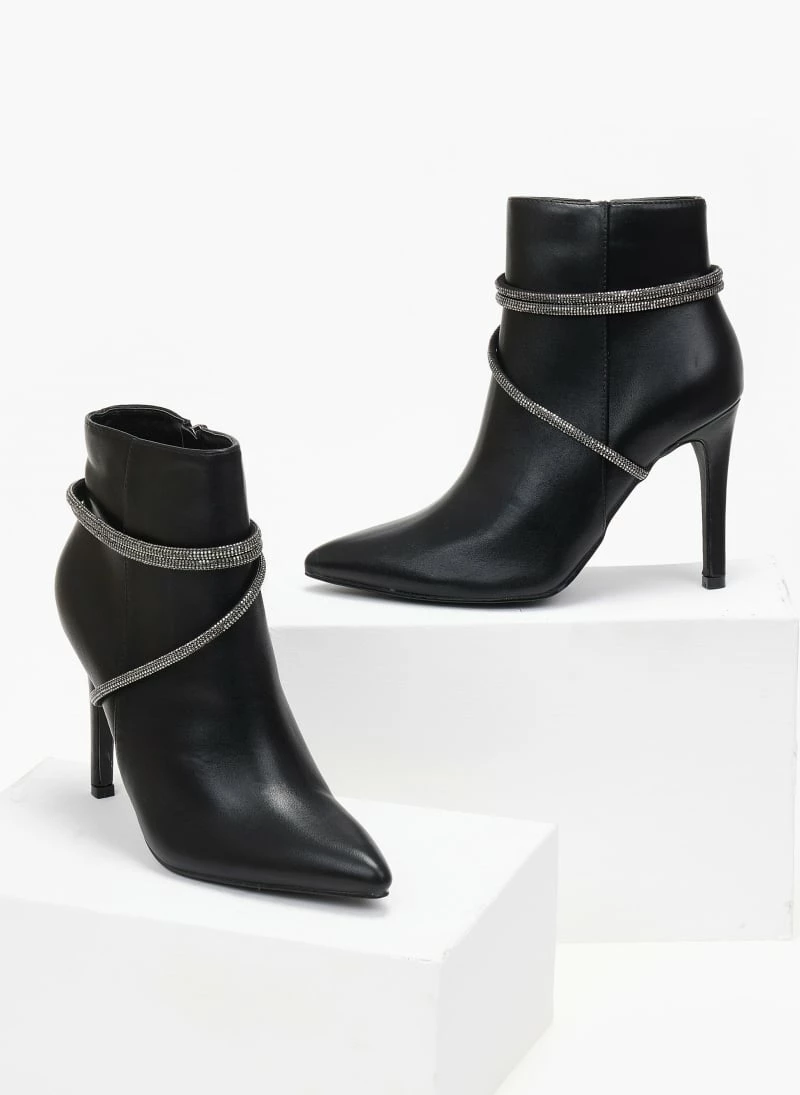 Μποτάκια μυτερά με λεπτό τακούνι. Έχουν σειρές strass στο πλάι και το ύψος του αστραγάλου.