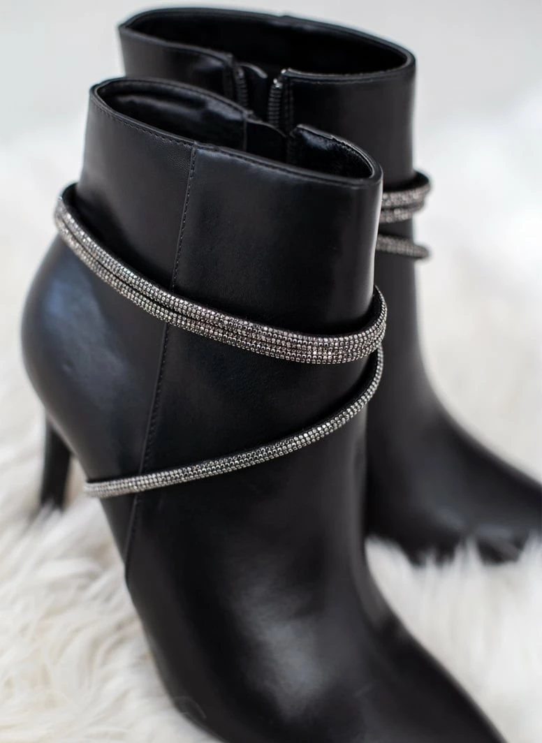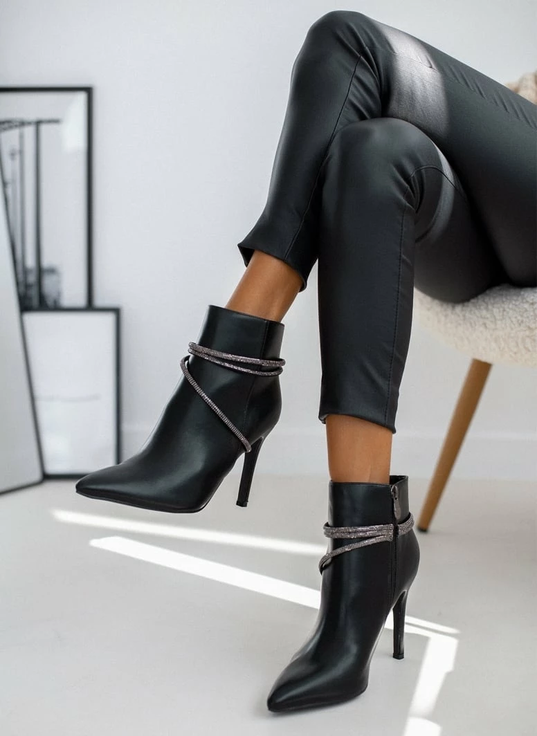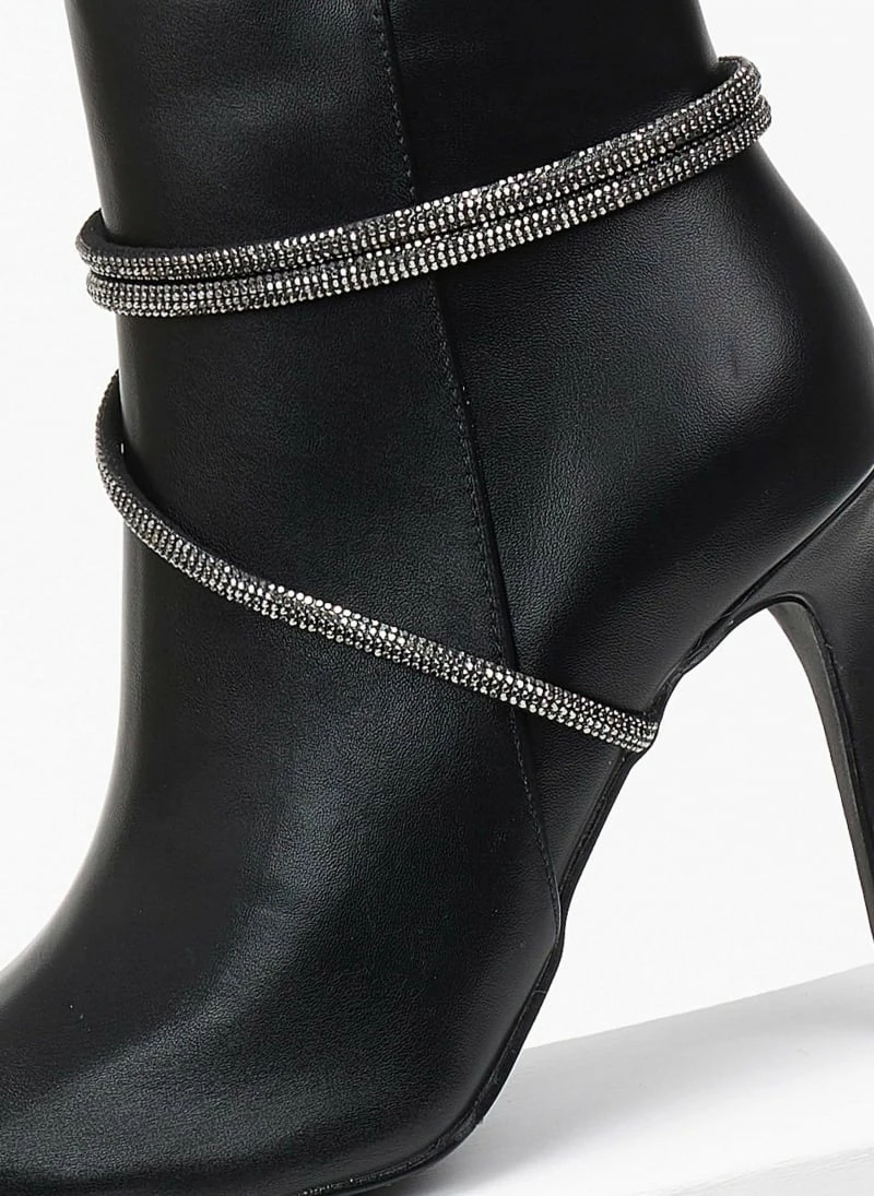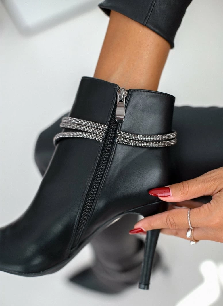 Μποτάκια μυτερά με λεπτό τακούνι. Έχουν σειρές strass στο πλάι και το ύψος του αστραγάλου.
