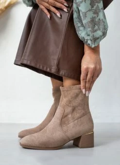 Μποτάκια από ελαστικό suede. Έχουν διακριτική μεταλλική λεπτομέρεια στο πίσω μέρος. Χαμηλό τετράγωνο τακούνι. Καρέ γραμμή. Ελαστική γάμπα.