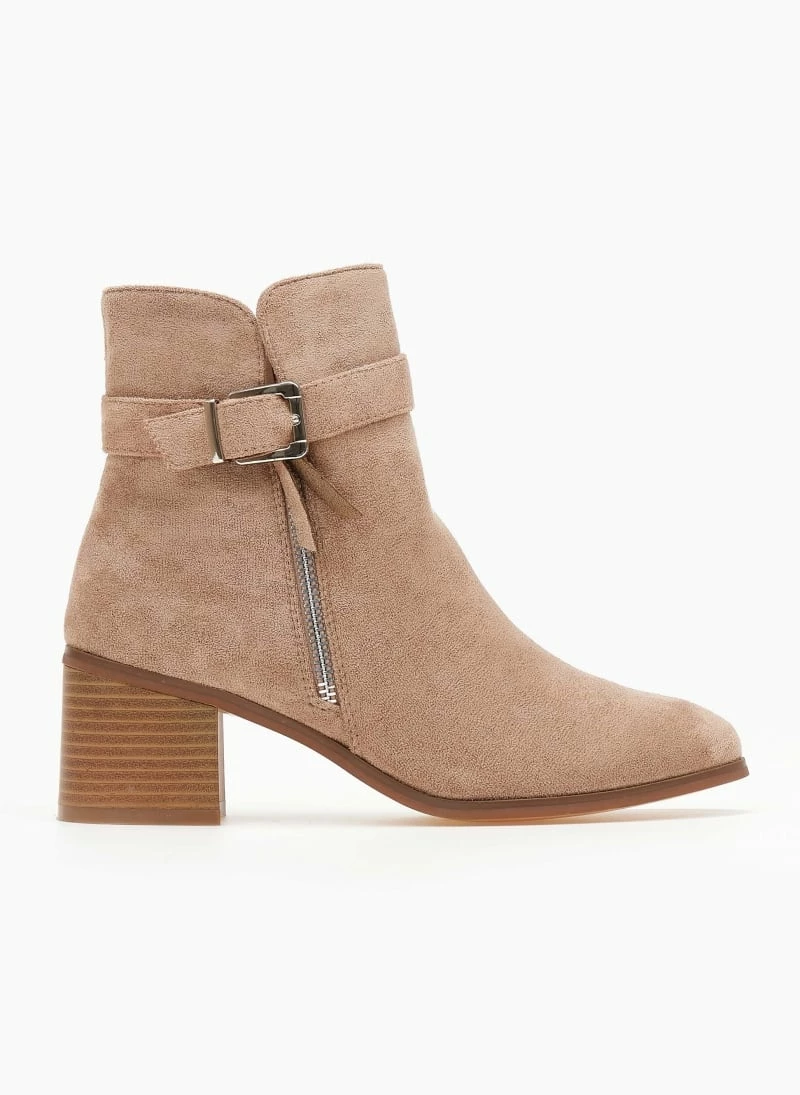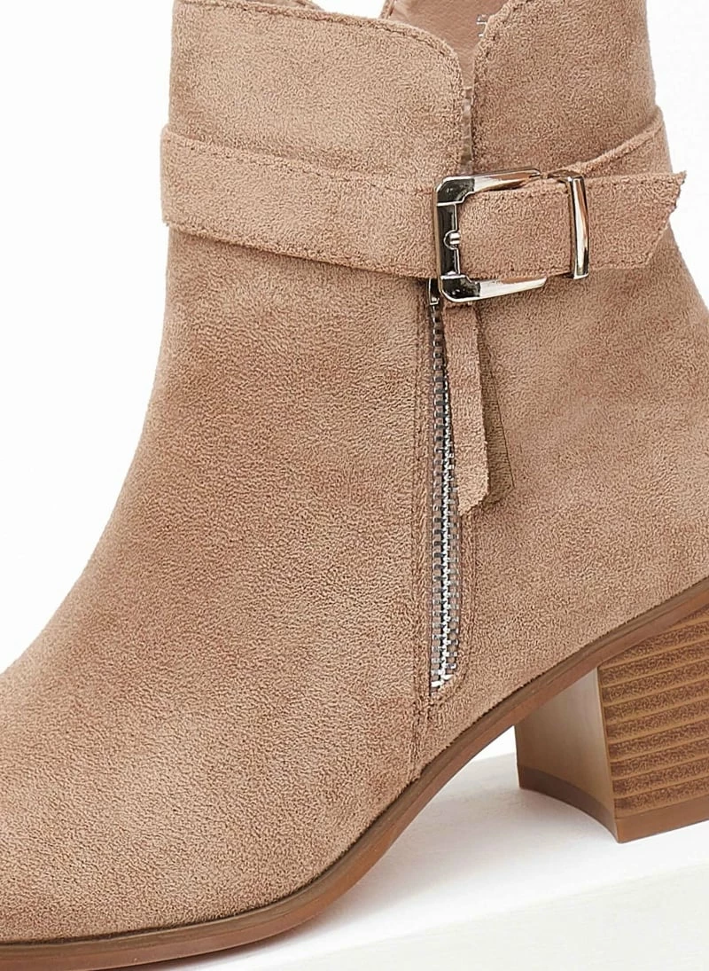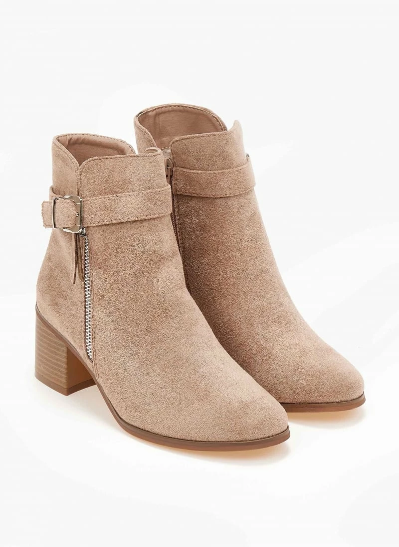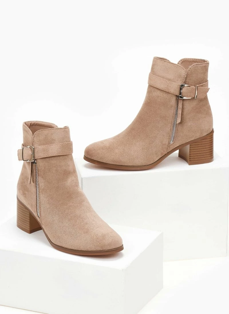 Μποτάκια suede με διακοσμητικό μεταλλικό φερμουάρ. Έχουν ζωνάκι στο ύψος του αστραγάλου. Μικρό άνοιγμα στο τελείωμα. Τετράγωνο ξύλινο τακούνι. Στρογγυλή γραμμή.