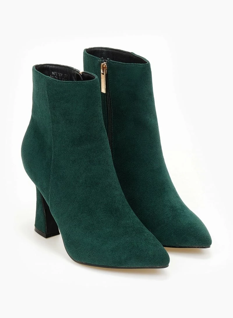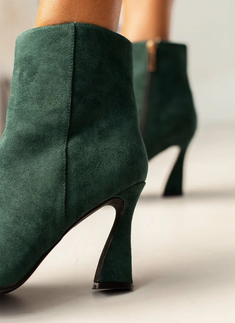 Μποτάκια suede με τακούνι καμπάνα. Έχουν κάθετη ραφή στο πλάι. Μυτερή φόρμα.