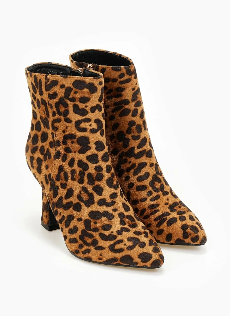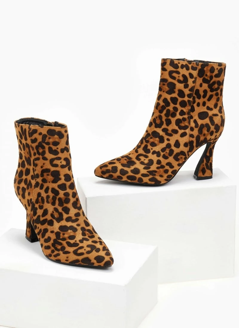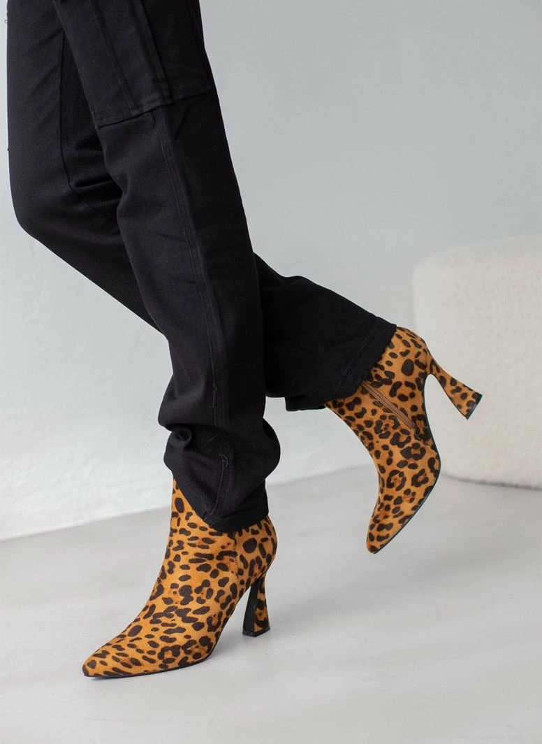 Μποτάκια suede με τακούνι καμπάνα. Έχουν κάθετη ραφή στο πλάι. Μυτερή φόρμα.