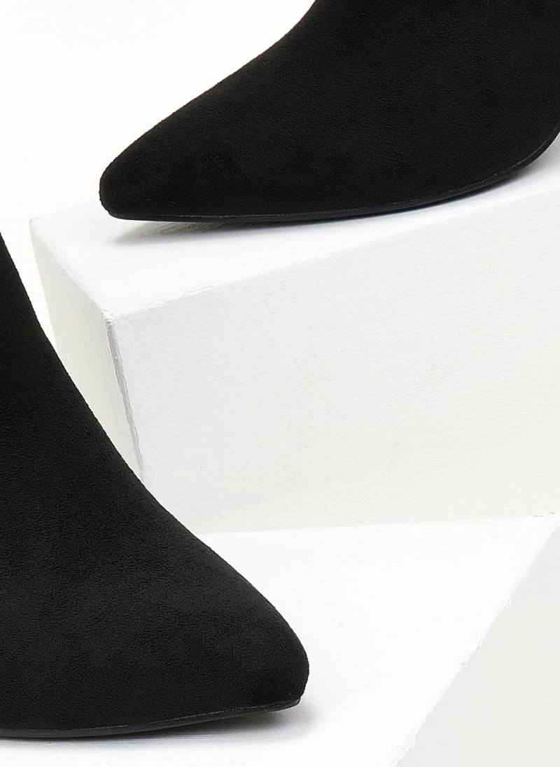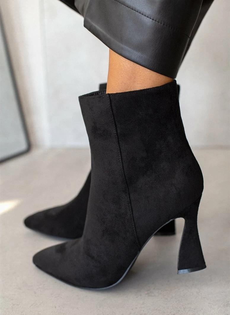 Μποτάκια suede με τακούνι καμπάνα. Έχουν κάθετη ραφή στο πλάι. Μυτερή φόρμα.