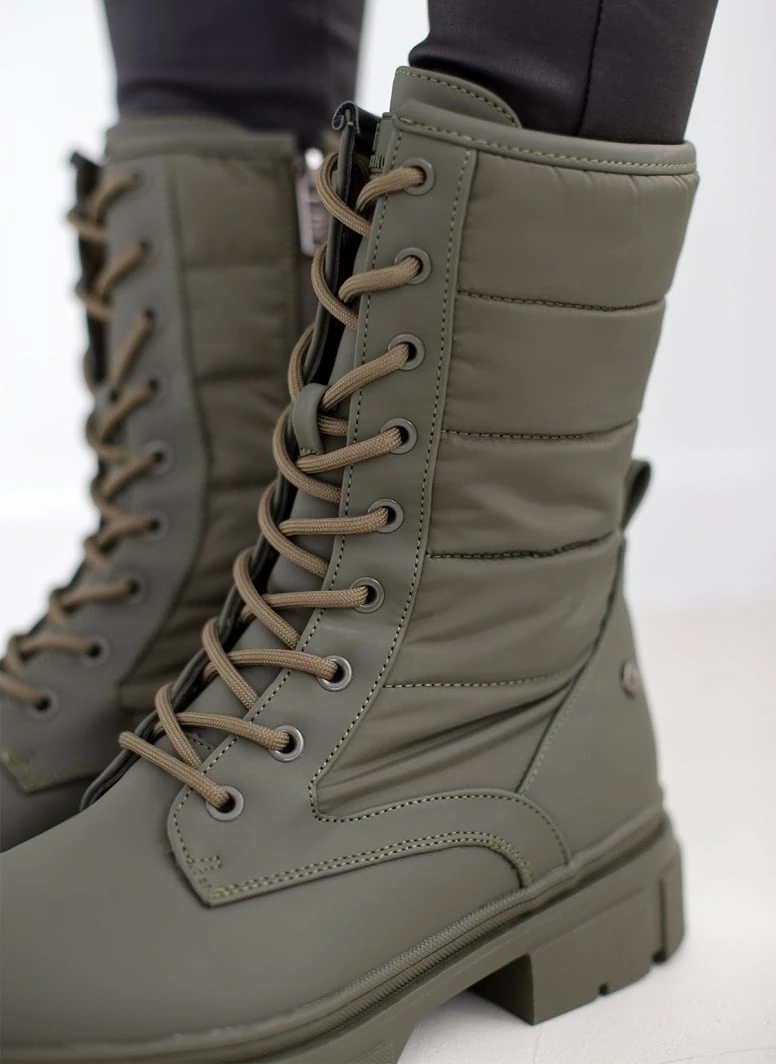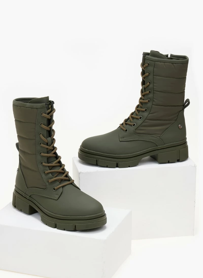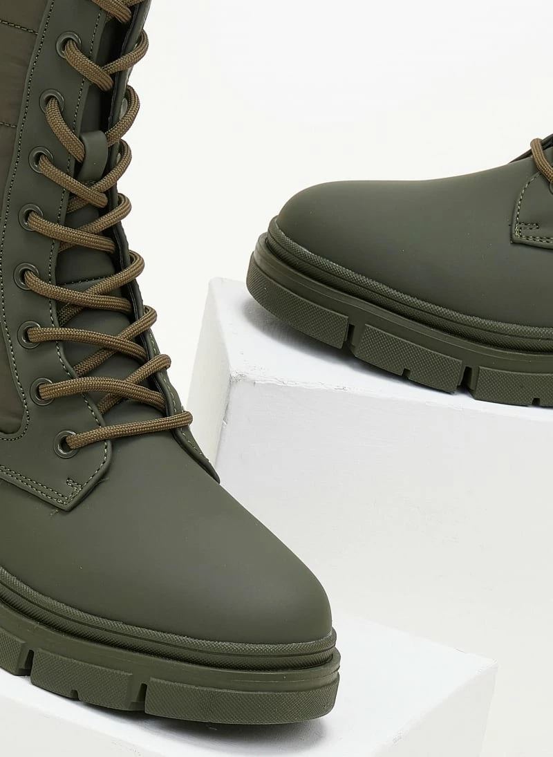 Αρβυλάκια με κορδόνια σε ματ χρώματα. Έχουν υφασμάτινο καπιτονέ σχέδιο στη γάμπα. Chunky σόλα με σχέδιο. Στρογγυλή γραμμή. Vegan approved.