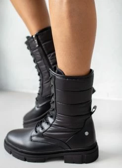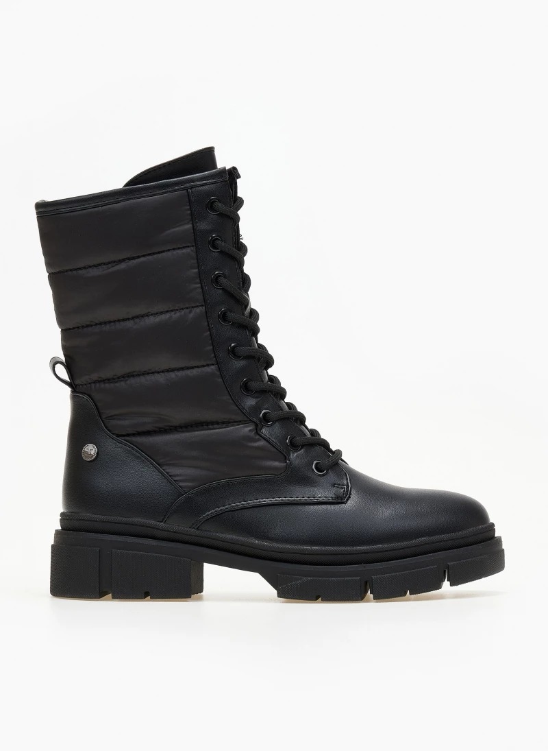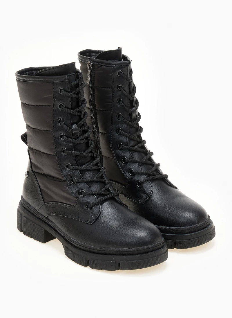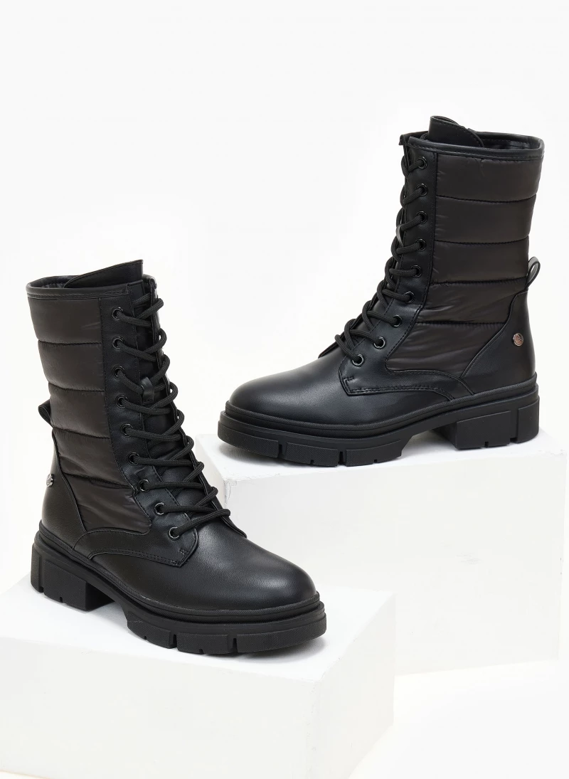 Αρβυλάκια με κορδόνια σε ματ χρώματα. Έχουν υφασμάτινο καπιτονέ σχέδιο στη γάμπα. Chunky σόλα με σχέδιο. Στρογγυλή γραμμή. Vegan approved.