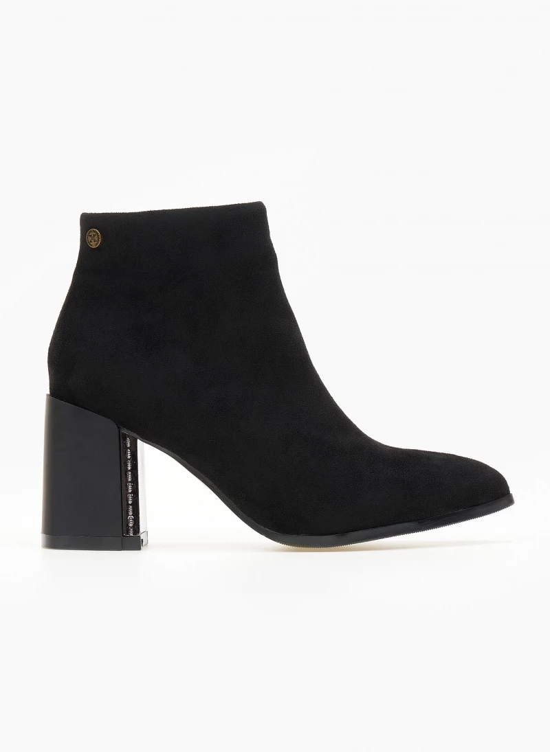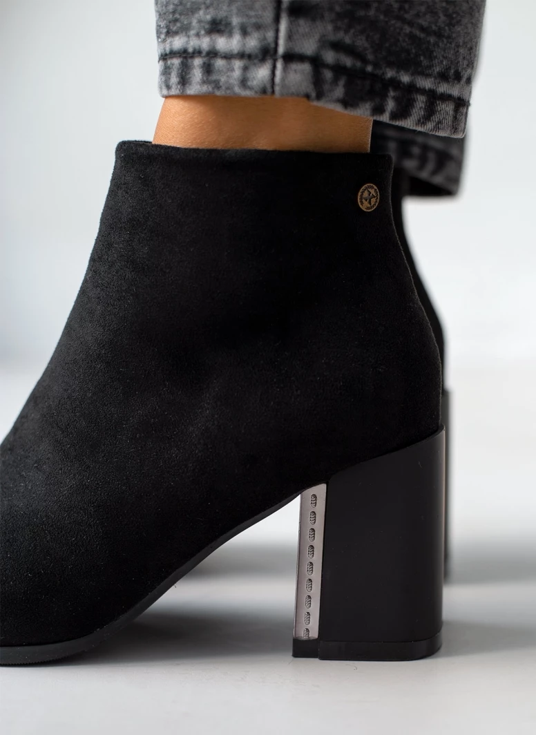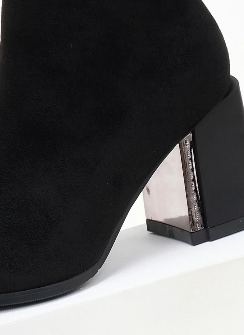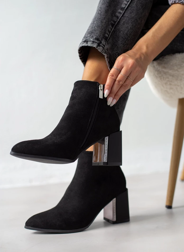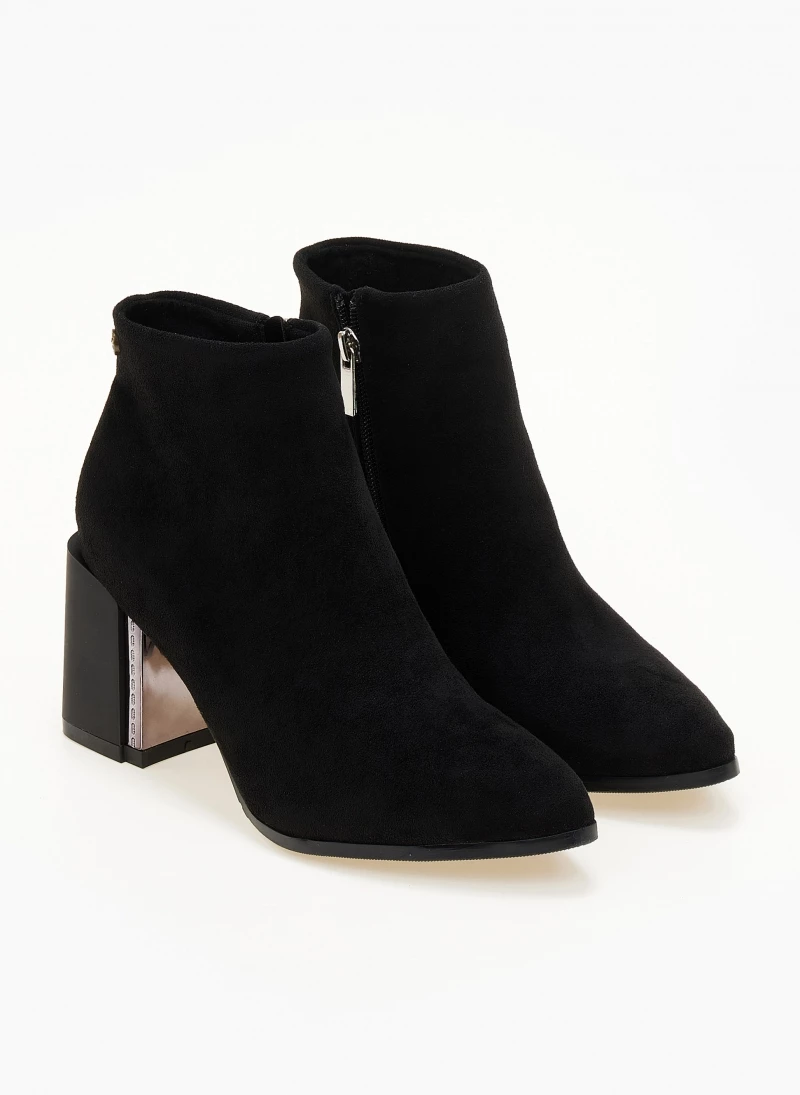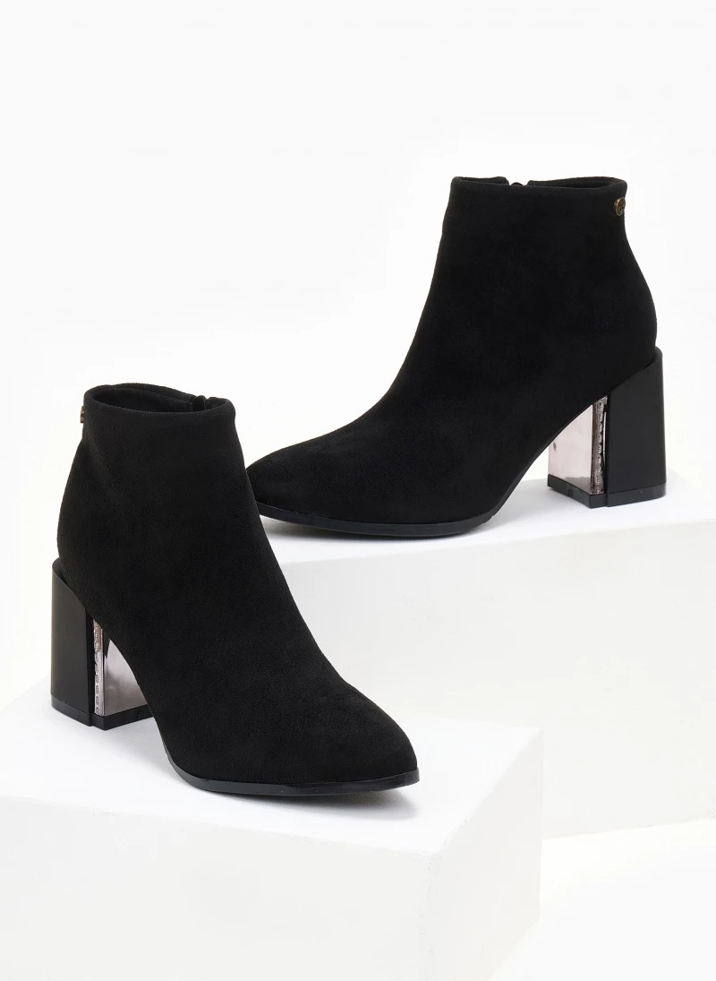 Μυτερά μποτάκια suede. Έχουν χοντρό τακούνι με μεταλλική λεπτομέρεια. Vegan approved