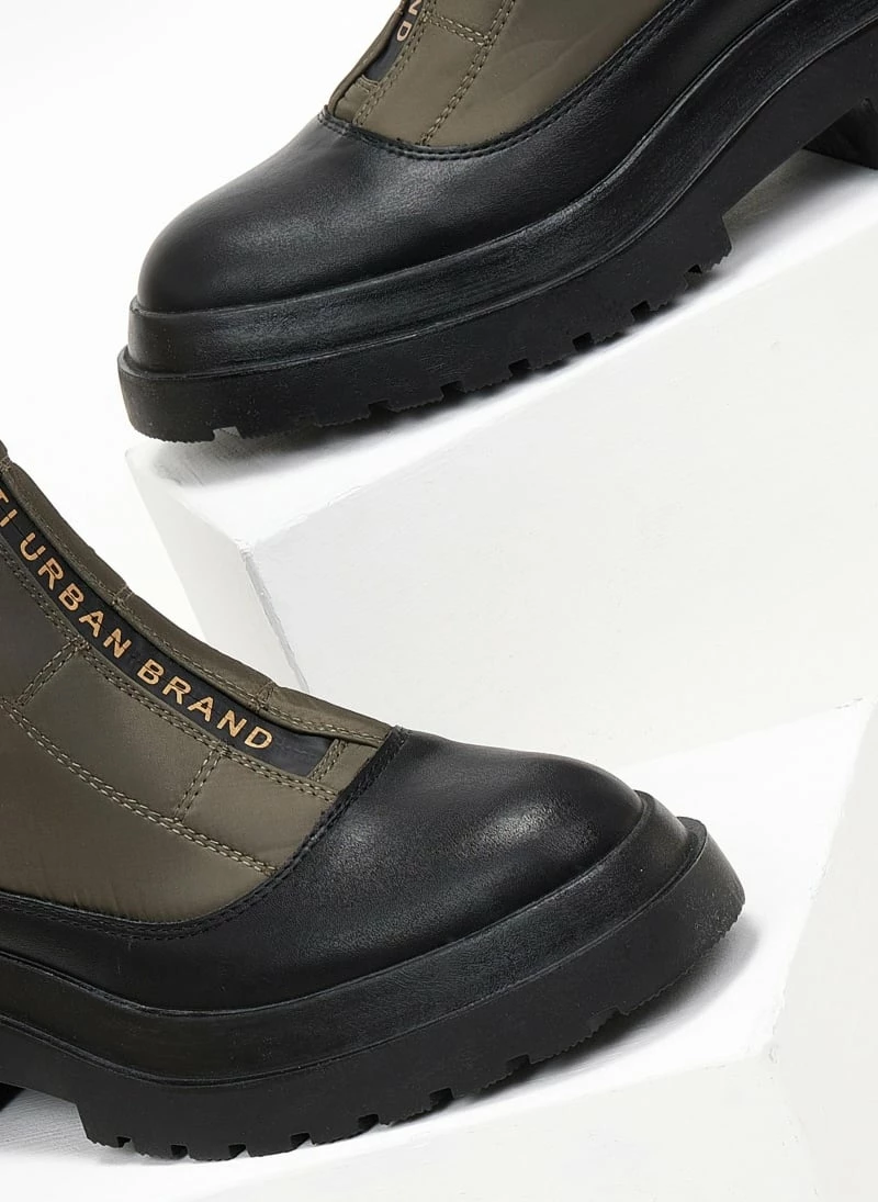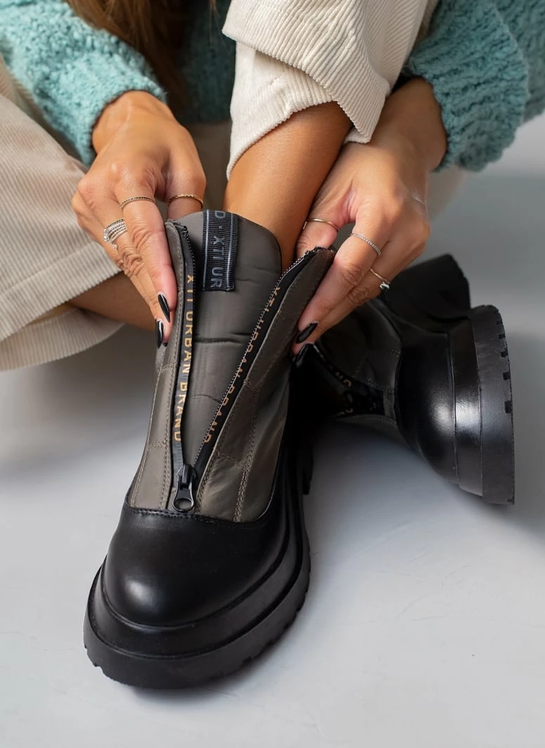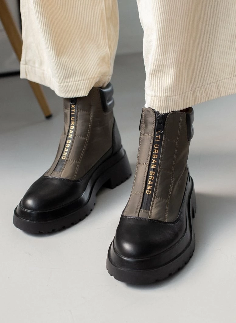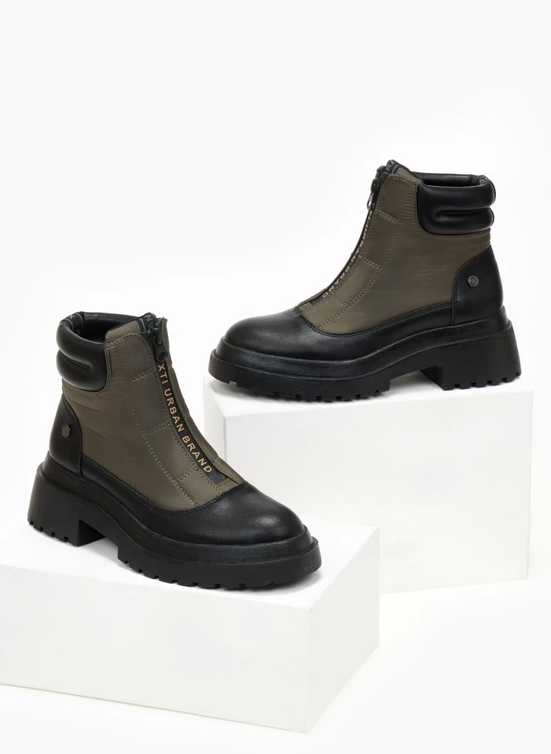 Casual Μποτάκια Xti με καπιτονέ λεπτομέρεια στο πίσω μέρος. Συνδυάζει τεχνόδερμα και ύφασμα. Chunky σόλα. Κλείνει με φερμουάρ στη μπροστινή πλευρά. Peta-Vegan approved.