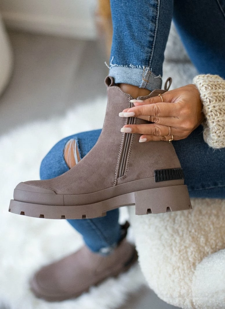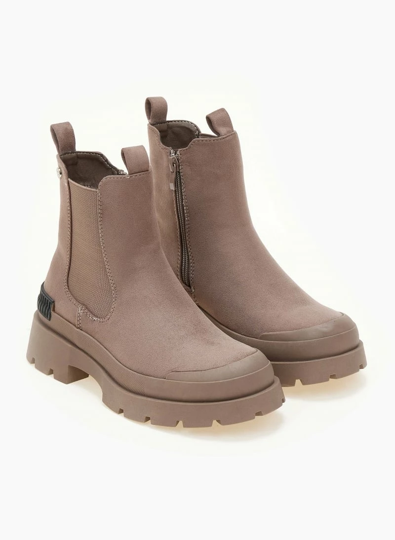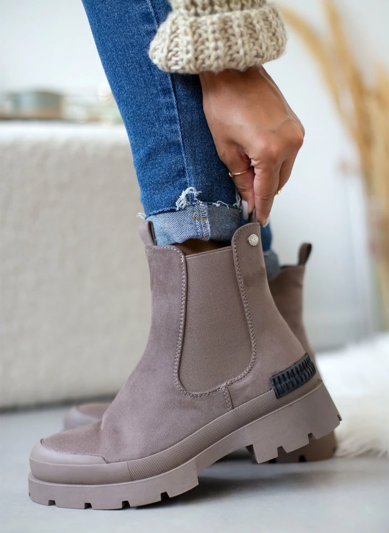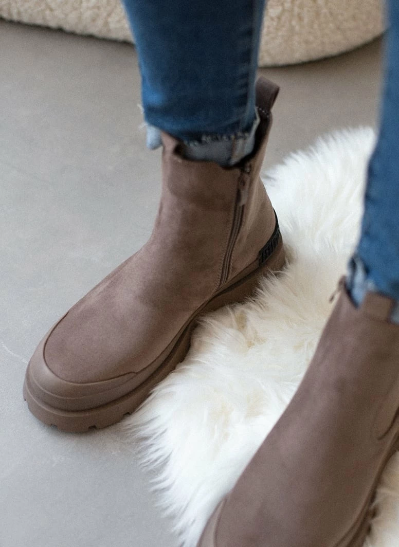 Suede μποτάκια με θηλάκια στο πάνω μέρος. Έχουν εξωτερική ραφή περιμετρικά από το λάστιχο. Ασύμμετρο τελείωμα. Τρακτερωτή σόλα. Vegan approved.