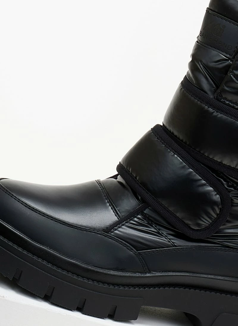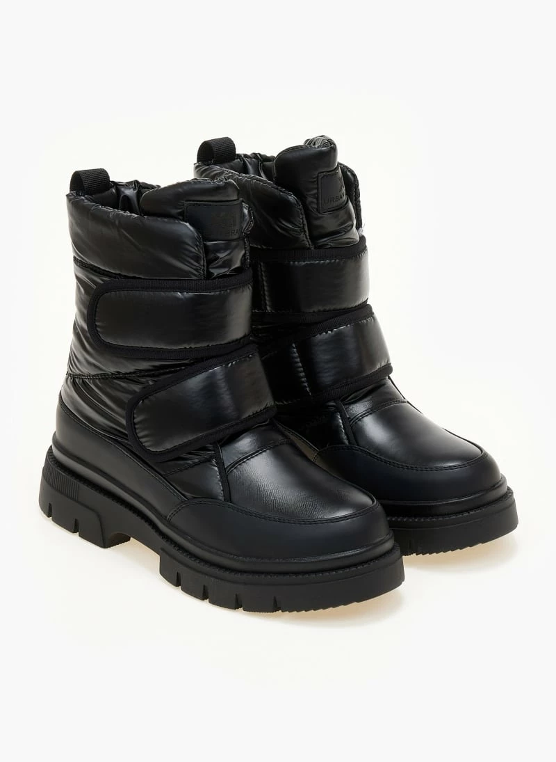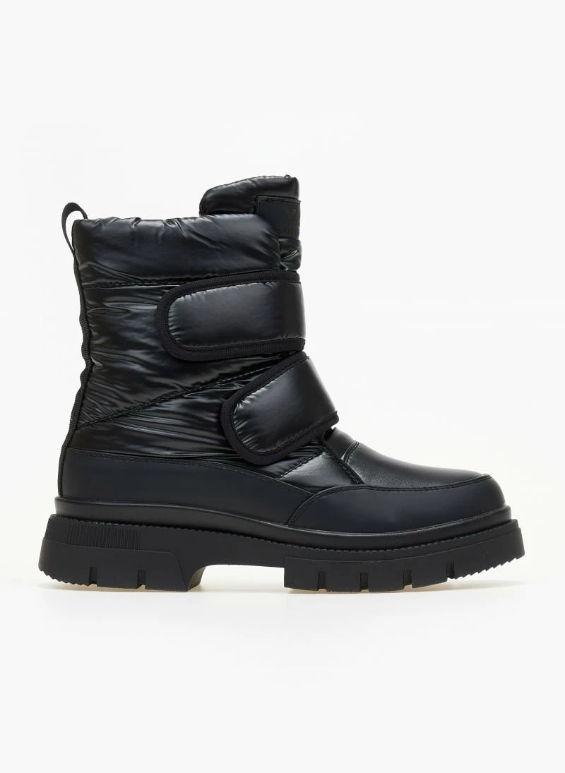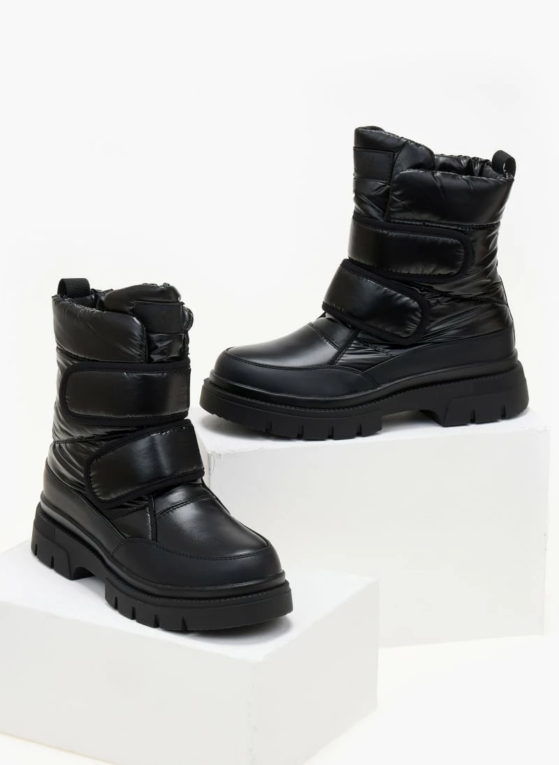 Μποτάκια φουσκωτά με υφασμάτινο καπιτονέ σχέδιο. Έχουν τρακτερωτή σόλα. Κλείνουν με velcro αυτοκόλλητα στtο πλάι. Vegan approved.